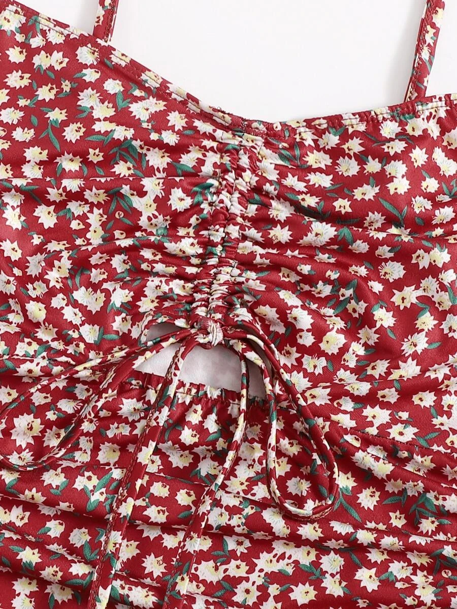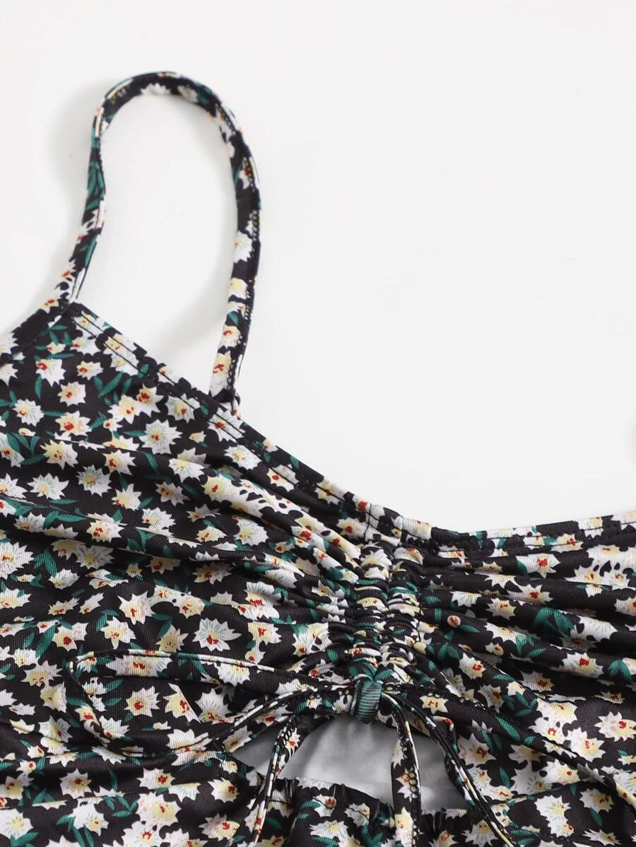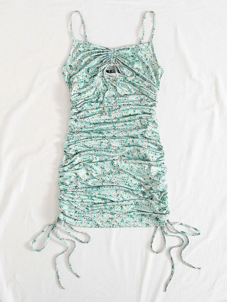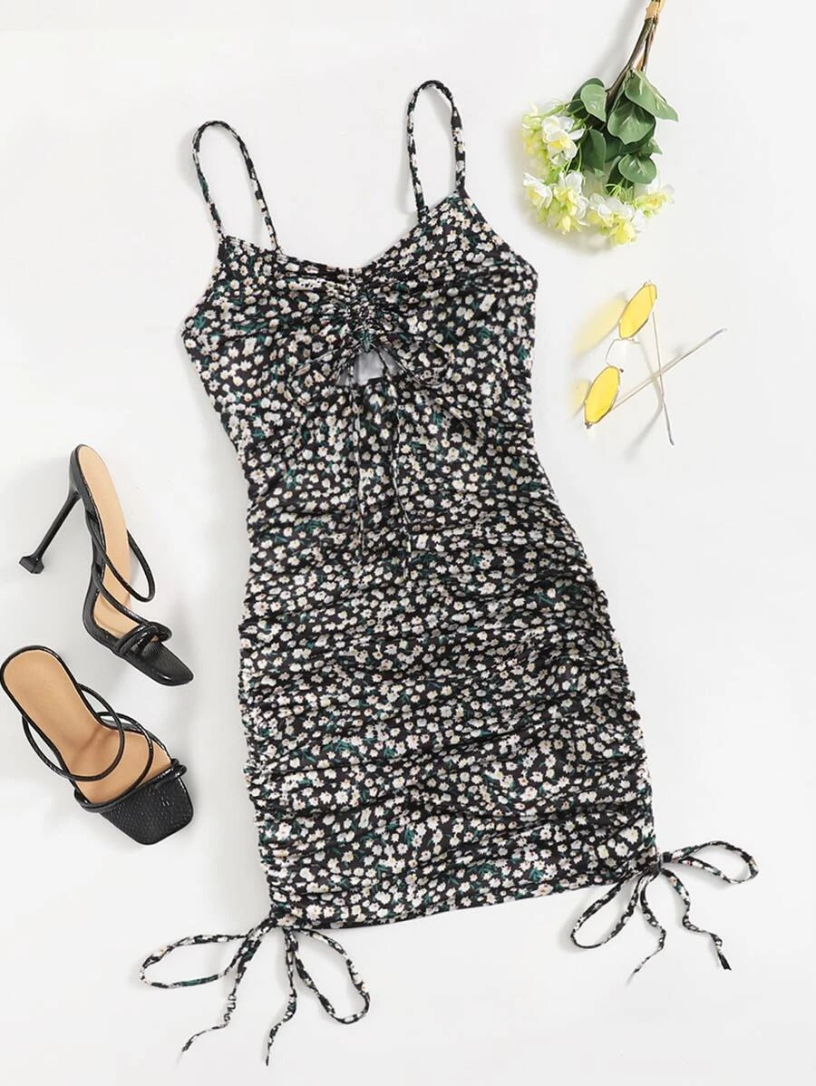 Cut Out Drawstring Knot Front Ditsy Floral Slip Dress11