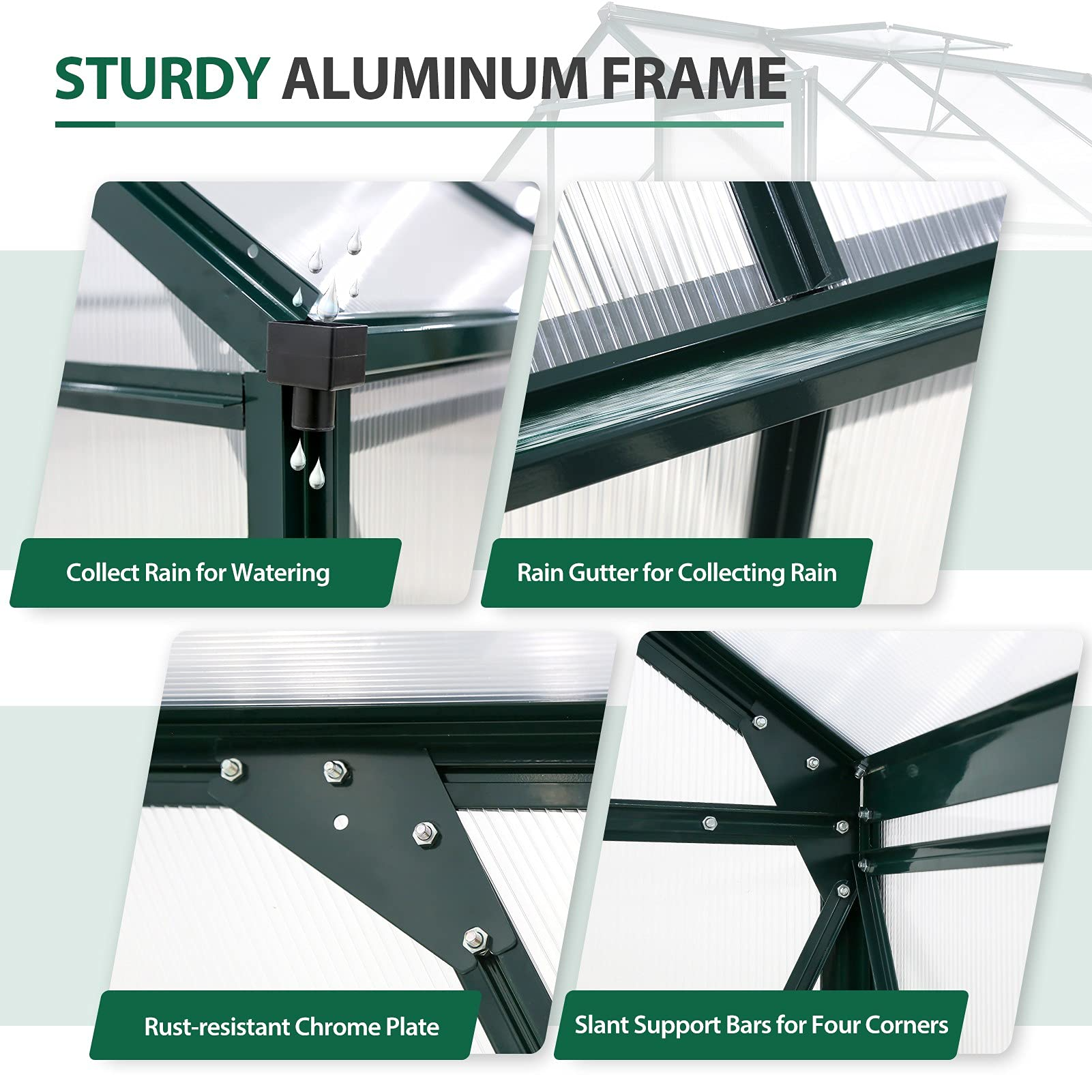 Adjustable Roof & Sliding Door: This aluminum frame greenhouse features a sliding door for easy access and a roof vent for ventilation. The roof vent is designed with 5 adjustable angles for proper air flow, and provides continuously fresh air to your plants.