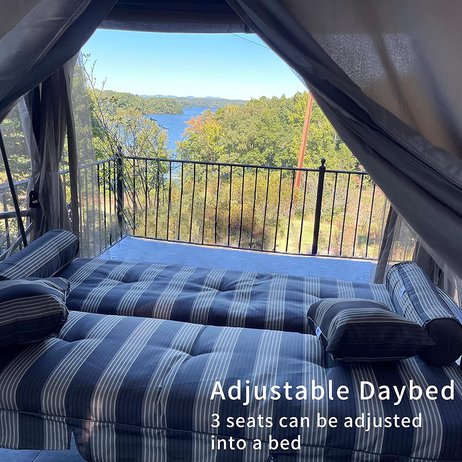 🌞【Comfortable & Stylish】Net and curtains providing additional shade coverage. Three wide removable seats give you plenty of space, it also can turn into bed. Swing cushions and pillows makes it more comfortable for your back or arm.