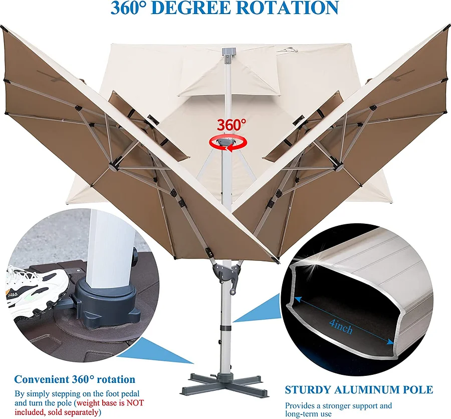 • ☂『360 DEGREE ROTATION & SMOOTH TILTING』 - The outdoor patio umbrella can be rotated 360° horizontally by simply stepping on the foot pedal and twisting the pole. In addition, the super smooth adjustment tilting system can change the angle of the canopy and keep the area protected throughout the day.