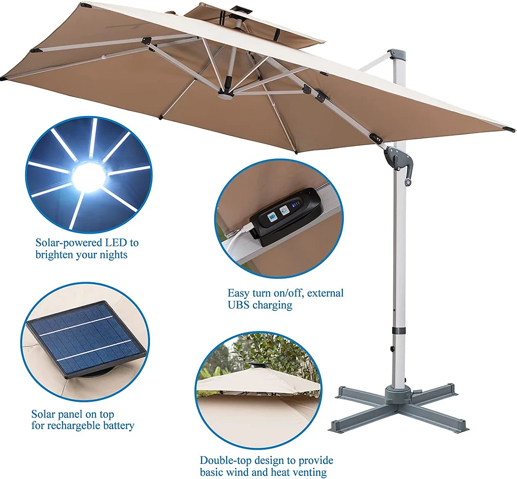 • ☂『SOLAR LED LIGHTS BRIGHTEN YOUR NIGHT』 - 8 heavy-duty ribs with LED light tubes and one central light provides perfect lighting in the day and night for your friends and family, which creats a relaxing and romantic atmosphere in the evening. The solar lighting system does not need power cord, a top-mounted solar panel provides efficient and effective energy.