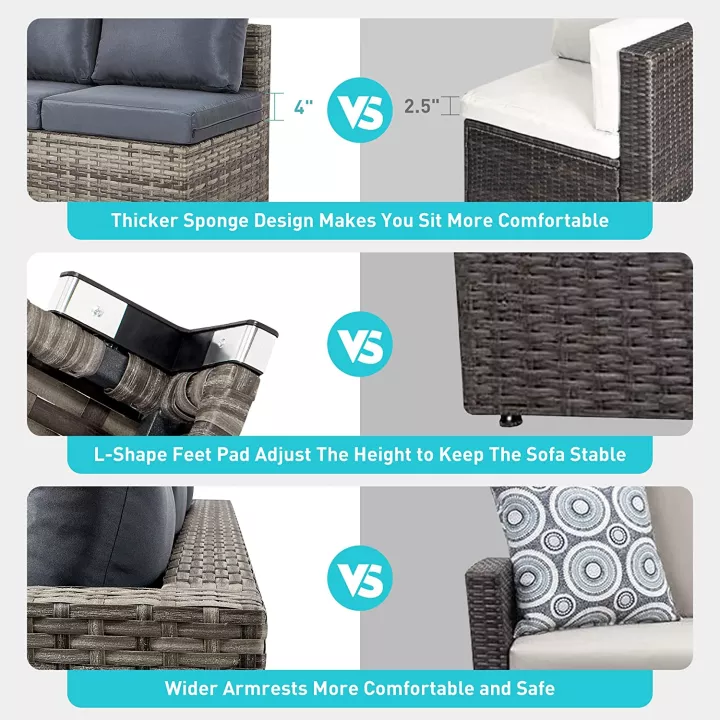 About this project 1. Sturdy and durable semi-assembled: The garden furniture set is a one-piece seat. The advantage of the one-piece seat is that it is not easily deformed, and is more stable and durable than the split seat. Some parts require assembly, saving most of the assembly time and effort. This wicker outdoor furniture set will ship from us in a box of 2, complete with instruction manual. 2. Easy to clean: Soft seat cushion, easy to rinse. Just zip up the machine washable cushion covers and give them a quick wash to leave them looking like new. Tempered safety glass on top of dining table, ideal for low maintenance. The rattan part of the outer frame can be flushed directly with a hose. After rinsing, just put it in a ventilated place (not exposed to the sun). 3. Garden Furniture Design: Elegant fabric cushions and wicker, comfortable and eye-catching. 7 Seat Rattan Garden Furniture Set is perfect for your garden, lawn, patio, backyard or greenhouse area, 4. After Sales Service: We offer free parts replacement (such as foot pad adjustment and screws), if you find the 5 piece patio furniture set has Any questions, please don't hesitate to contact us first.