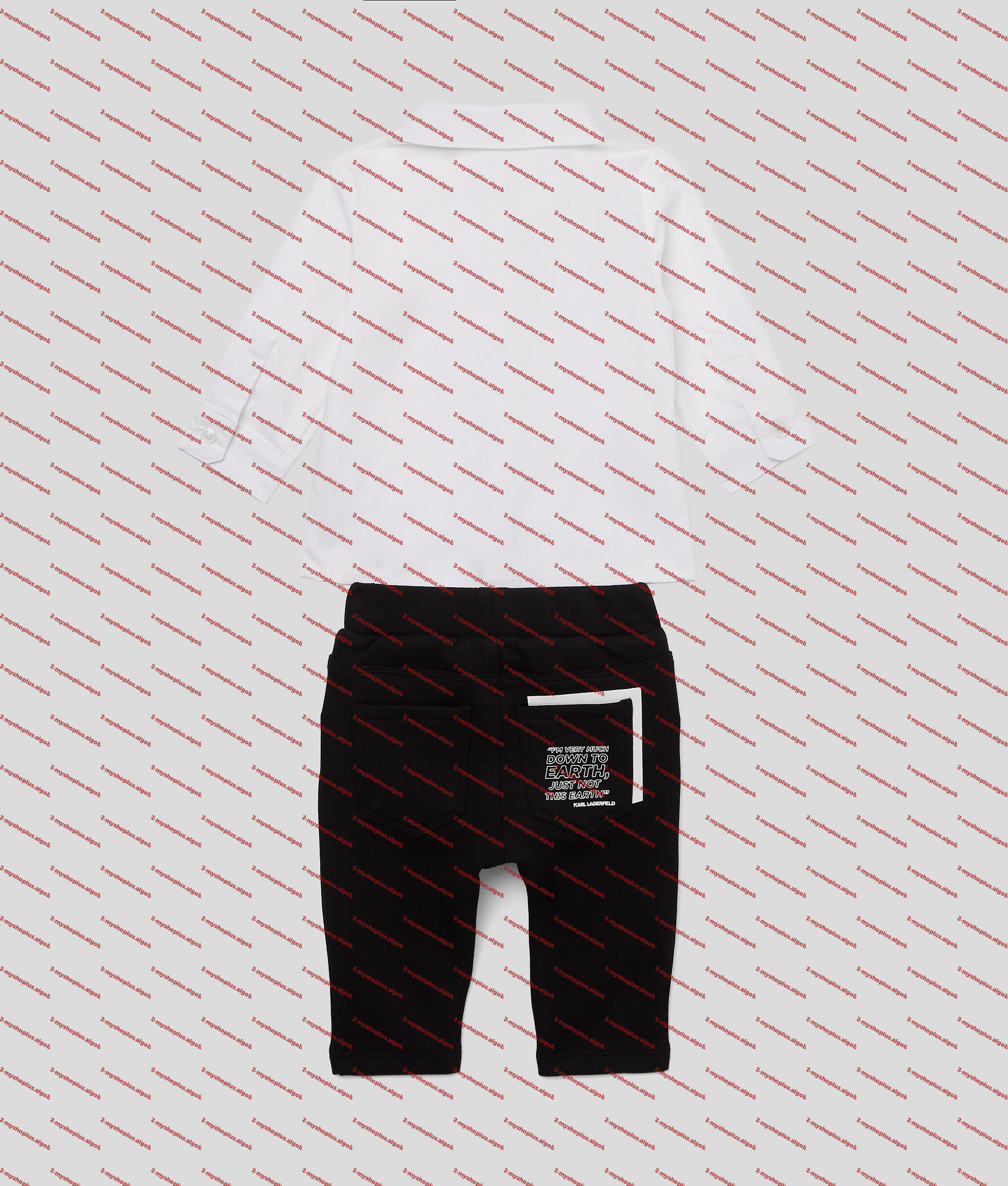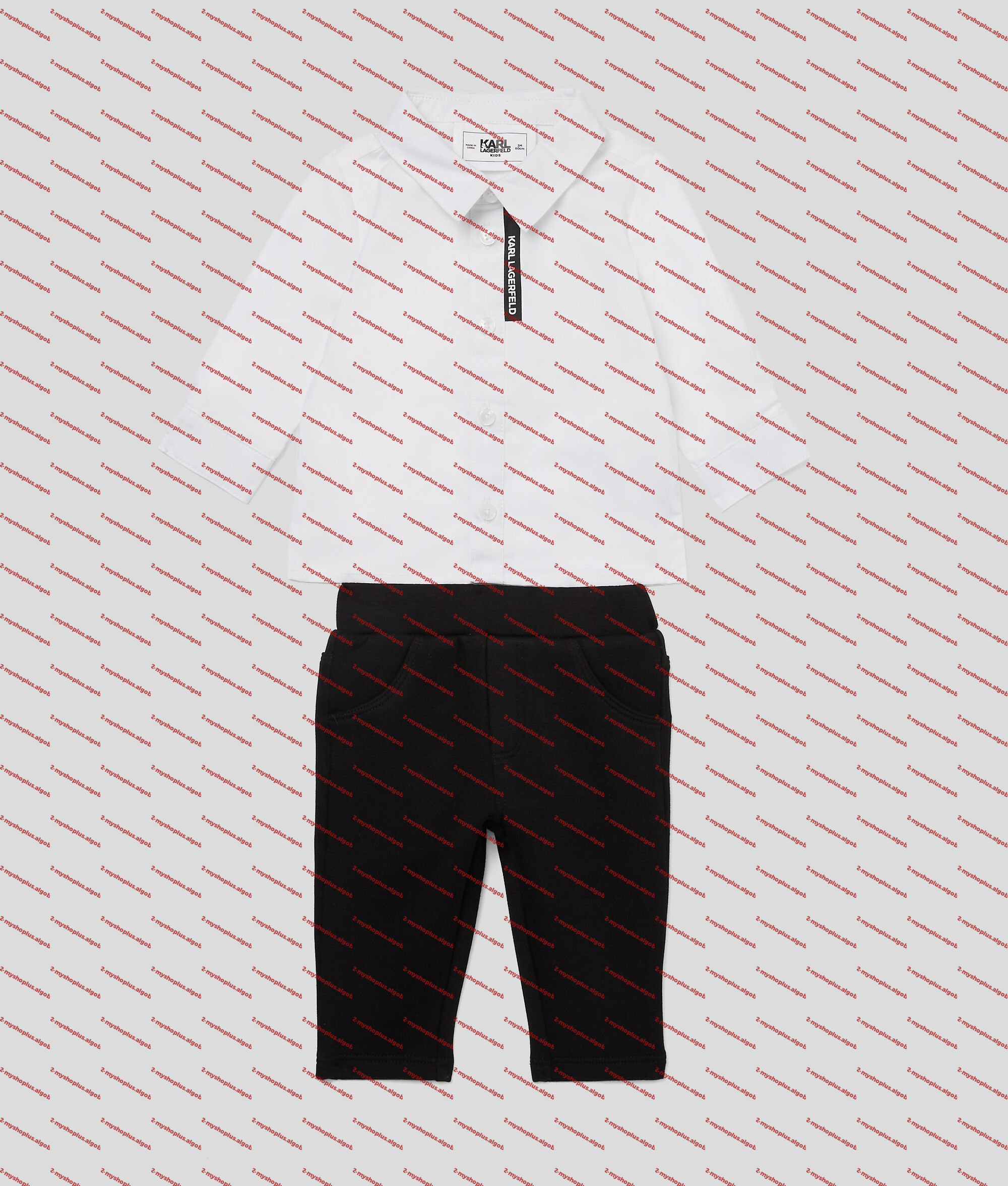 Le premier costume de bébé s'adapte à toutes les occasions. L'emblématique chemise en popeline de Karl avec logo imprimé à la verticale le long de la patte de boutonnage s'associe à un pantalon noir extensible pour un look classique indéniablement Karl.