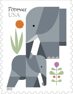 The Elephants stamp is being issued as a Forever® stamp in booklets of 20. This Forever stamp is always equal in value to the current First-Class Mail® one-ounce price.