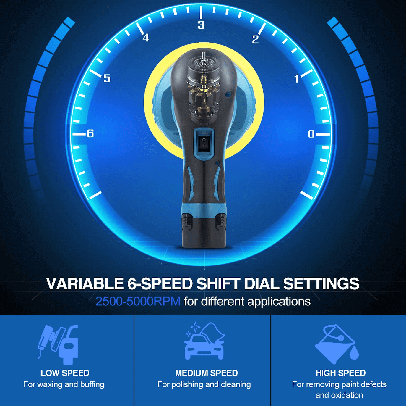 It offers professional-grade power, with adjustable speeds from 2500 to 5000 RPM, making it suitable for both novice and experienced users. Additionally, our car polisher boasts an anti-slip ergonomic handle that fits perfectly in the palm of your hand, providing maximum comfort and control during use.