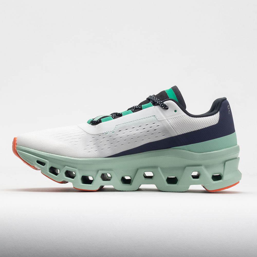 Meet the On Cloudmonster! Featuring the largest CloudTec? pods, this high-cushioned running shoe leads a beastly ride. Enjoy pillow-soft landings on the Helion? midsole while the signature Speedboard? drives you forward. The radical forefoot rocker design keeps you rolling smoothly during longer efforts. Made with recycled materials, the On Cloudmonster blends an eco-friendly approach with a sustainably soft ride.