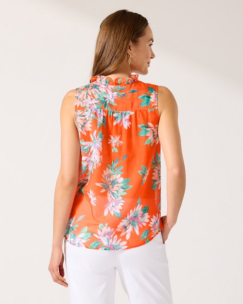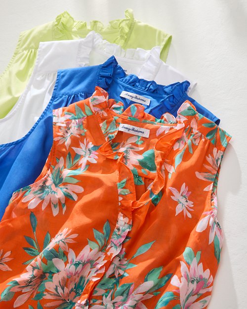 A show-stopping print and ruffle detailing make this top stand out among the rest. Made with our airy Agua Amara fabric, this sleeveless top was designed for embracing the warm breeze and dressing to impress.