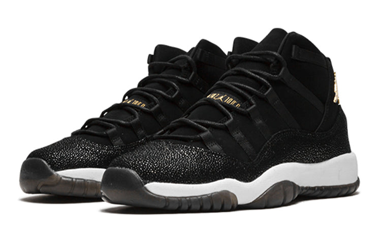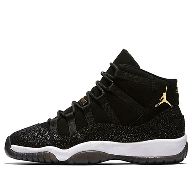 The Air Jordan 11 Retro Prem HC is a shoe that was designed for little girls. It has a black suede upper with shimmering metallic accents, giving the shoe a luxe look. The leather mudguard has a glitter effect which adds some shine to every step. Michael Jordan's player number and are embroidered in gold at the heel. A black, semi-translucent outsole partially wraps a plush, white midsole for stable cushioning