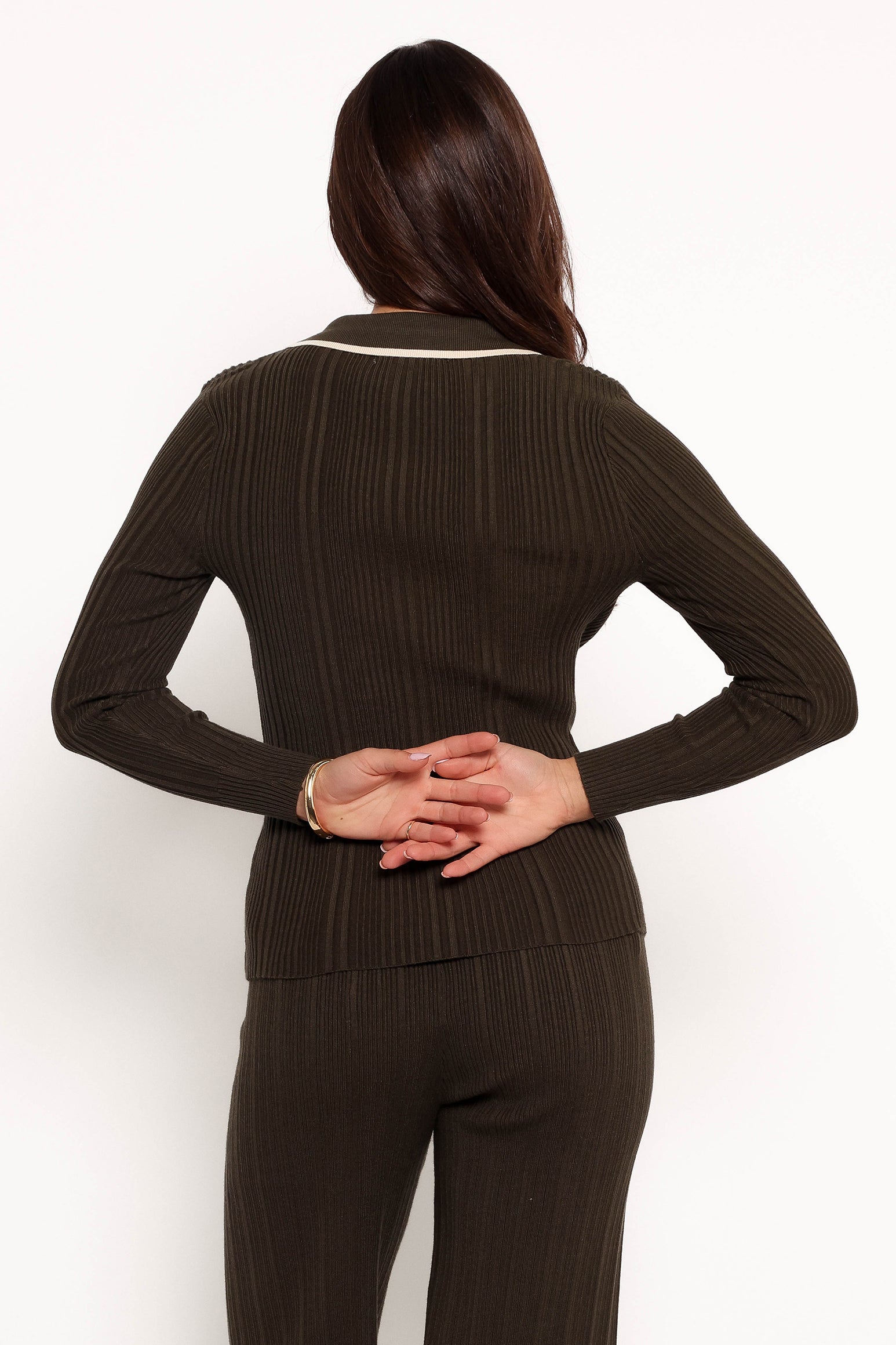 DETAILS Elevate your wardrobe with the Alondra Cardigan Knit Top in Olive, your perfect blend of comfort and style. Crafted from ultra-soft stretch ribbed fabric, this top features a flattering v-neckline and a chic collared design that seamlessly balances casual and refined vibes.