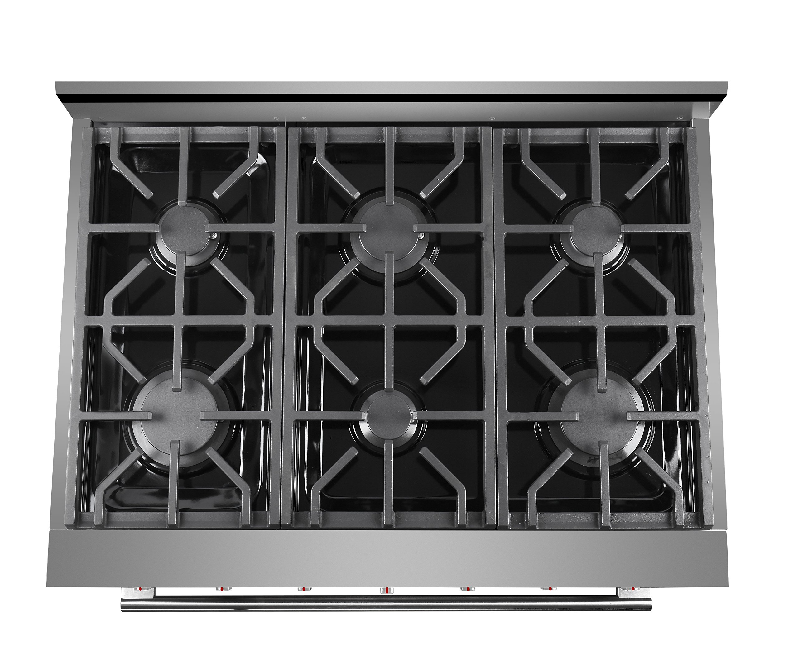 - 6 burners featuring high power 18,000 BTU and low power 6,000 BTU German made single-stack burners, 10,000 BTU broiler burner, 22,000 BTU oven burner