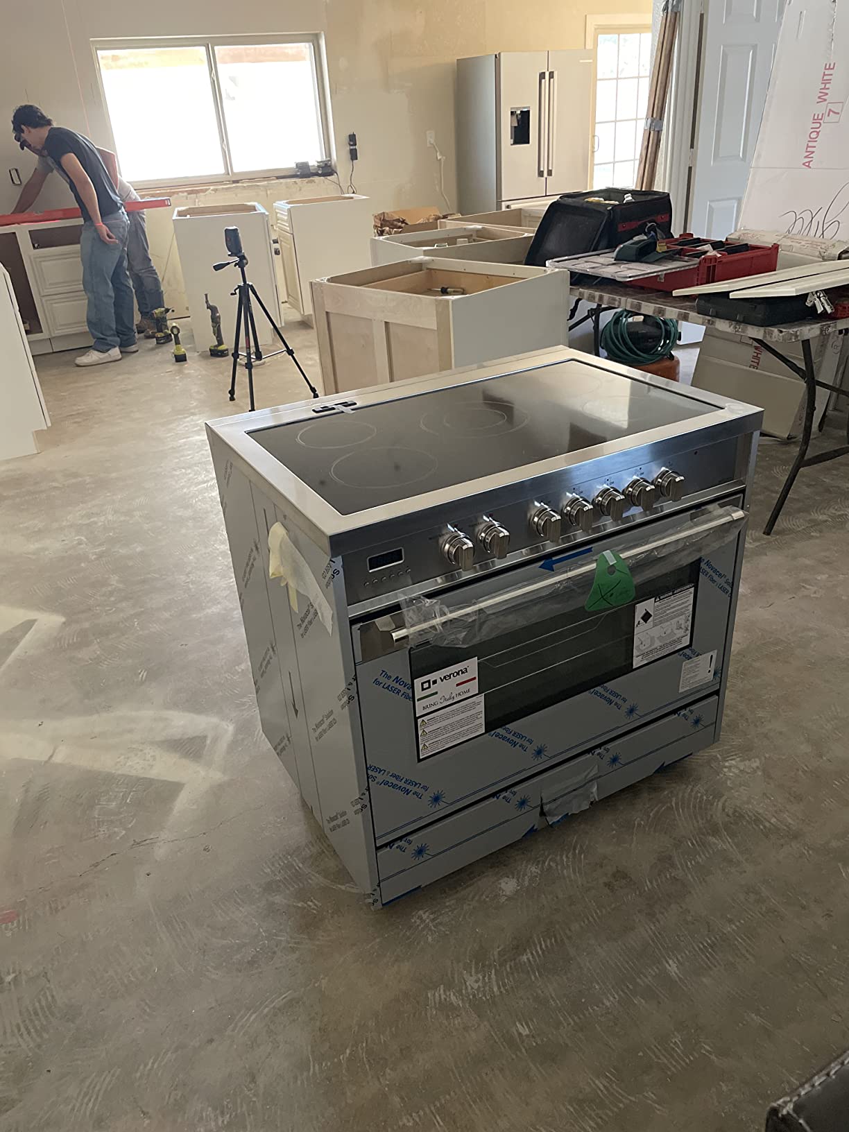 Made in Italy - The stylish Verona line of ranges, ovens and cooktops are a preferred brand of appliances featured in upscale kitchens throughout Europe since 1958. Each Verona piece is exquisitely designed and manufactured in the suburbs of Venice, Italy and stand as a benchmark for durable and beautiful Italian professional appliances. Verona products are held to stringent standards of quality unsurpassed in the industry. The Designer Series 36" all electric range comes with 5 elements including one dual element on black ceramic smooth cooktop. It also features 5.0 Cu. Ft true European convection oven, Broiler Yes, beveled door, stainless steel round handle, Pullout storage drawer and touch control clock and timer. more efficient oven cavity and deeper footprint at 25 ¼”.