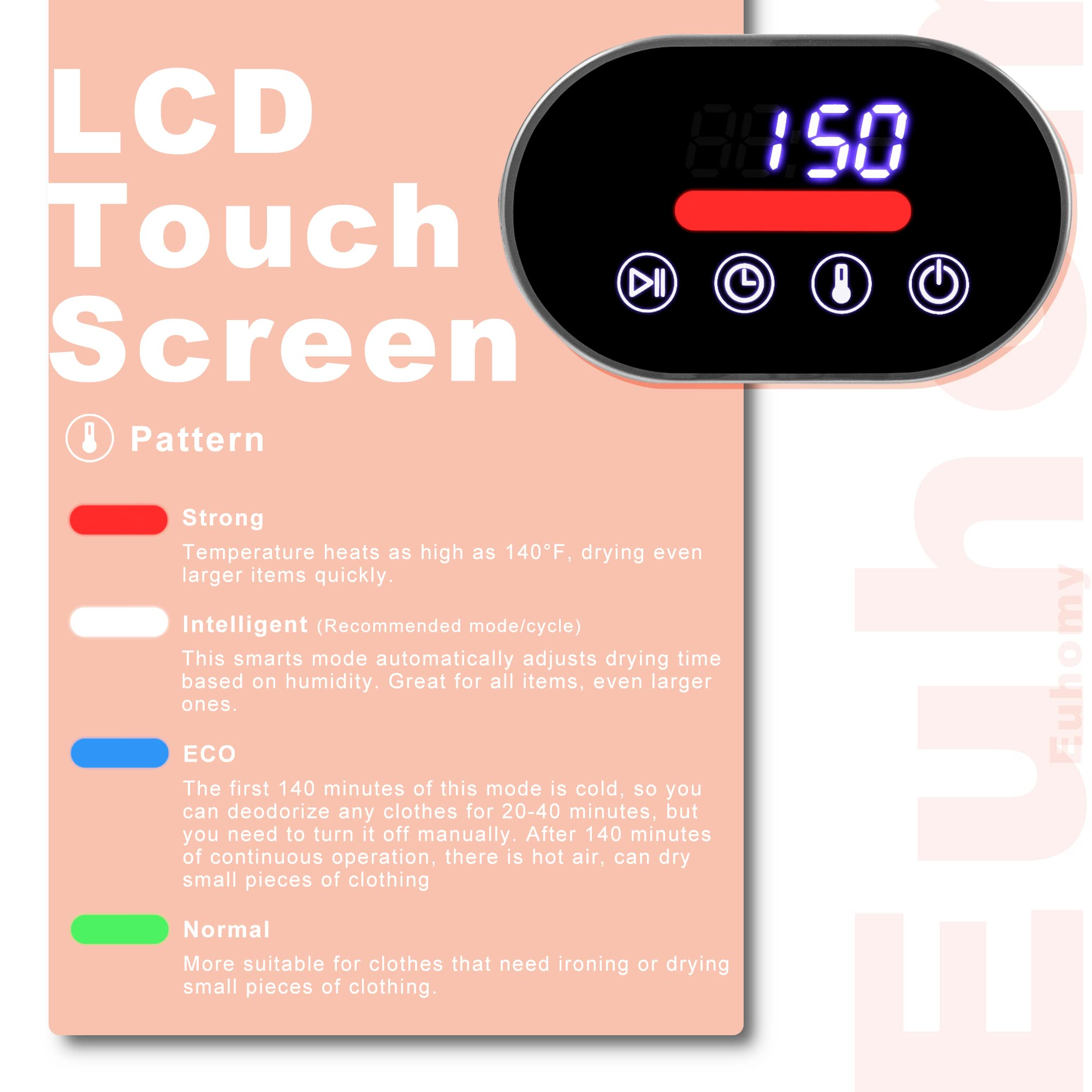 【Multi-function】 Our electric clothes dryer machine features a liquid crystal display (LCD) and has four drying modes: 1.Strong: drying even larger items quickly. 2.Intelligent: This smarts mode automatically adjusts drying time based on humidity. Great for all items, even larger ones. 3.ECO: Deodorize any clothes ,dry small pieces of clothing 4.normal: More suitable for clothes that need ironing or drying small pieces of clothing.