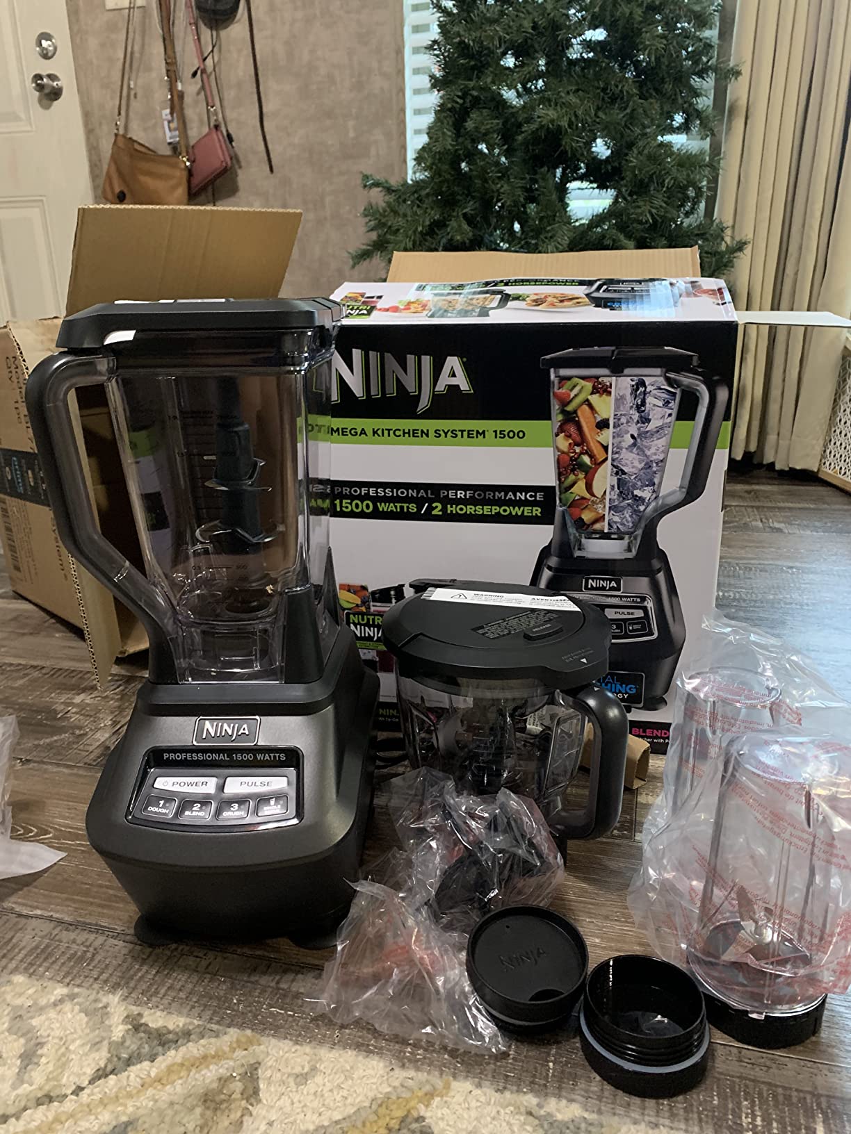 The Ninja mega kitchen system comes packed with 1500 watts of power to handle all of your drink and meal making needs. The XL 72 oz. blender pitcher features total crushing technology to blast through ice and frozen fruit. Two 16 oz. Nutri Ninja Cups with to go lids are perfect for creating personalized, nutrient rich drinks to take on the go. The 8 Cup food Processor bowl comes equipped with a chopping blade for perfect, even results and a dough blade that can mix up to 2 lbs. Of dough in 30 seconds.