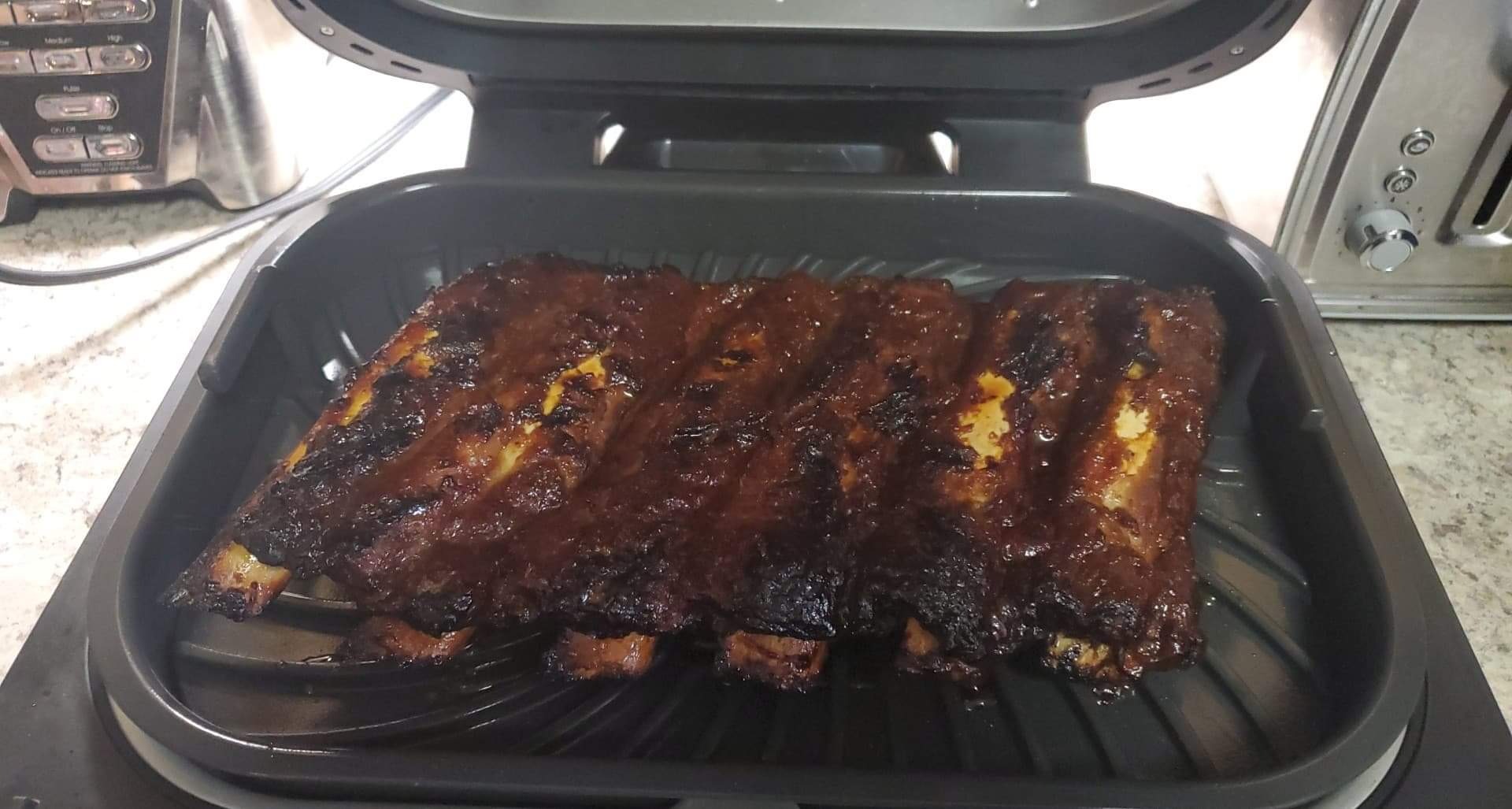 Meet the Ninja Foodi Indoor Grill. The grill that sears, sizzles, and air fry crisps. Updated sleek design from the original Foodi Grill. 500°F of hot cyclonic air for surround searing, while the 500°F high-density grill grate gives you delicious, char-grilled marks and flavor while being virtually smoke-free. It's also an air fry crisper, allowing you to enjoy guilt-free fried food.