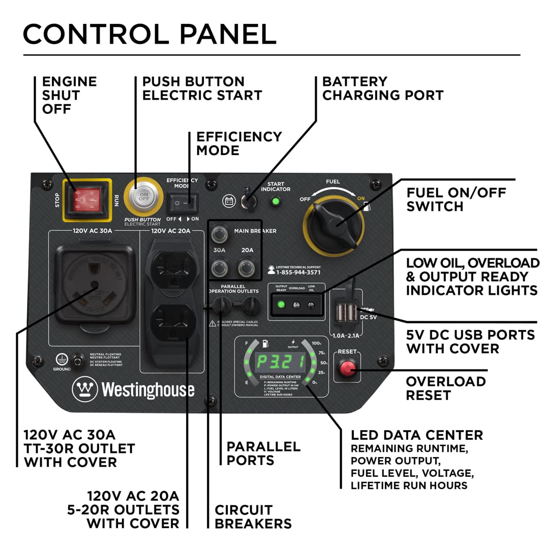 The Westinghouse iGen4500 Inverter Generator is a premium power solution to meet your portable power needs whether you're camping or on the go. With a TT-30R RV Ready Outlet, two 20A household outlets, and built-in USB ports, this generator is ideal for recreational activities or as an emergency backup source. It's engineered for maximum fuel efficiency with a variable engine speed to produce only the power you need at any given time, running for up to 18 hours on a 3. 4-gallon fuel tank to save you repeated trips to the gas station. Conveniently built with Push-Button Electric Start and wireless remote start for easy ignition. At less than 3% THD, the iGen4500 is perfect for running sensitive electronics like LCD/plasma televisions, laptops, tablets, or mobile devices that require clean, stable power. The LED Data Center has an automatic rotating digital display to keep you up to date for maintenance with real-time information. It features a lightweight, compact design with wheels and an extendable suitcase-style handle, making this model effortlessly more portable than traditional generators. The iGen4500 is ensured by 3-year limited service, labor, and parts coverage with lifetime technical support.