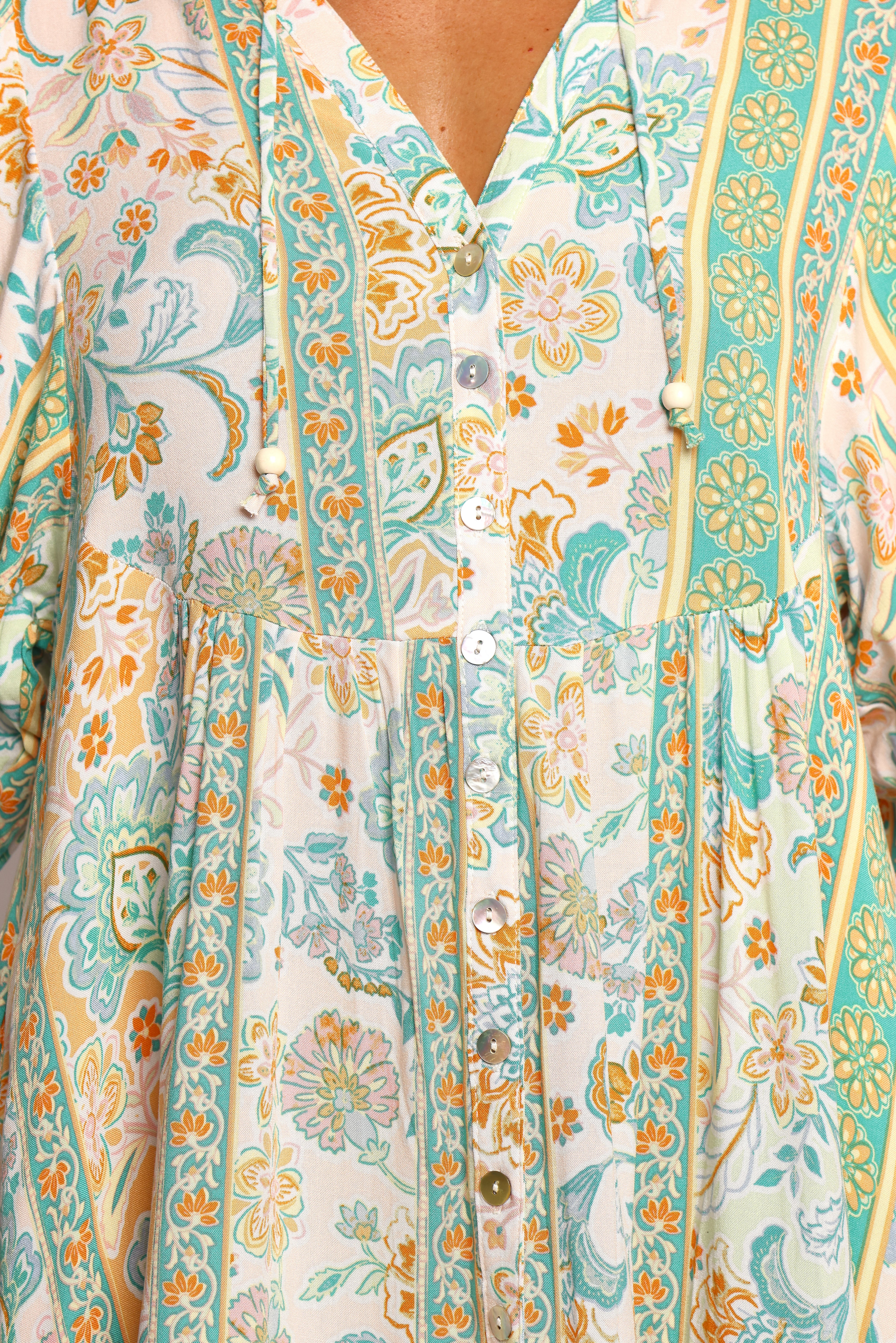DETAILS Featuring a graceful v-neckline adorned with a delicate tie and bead detail, it adds just the right touch of elegance. The mid-length sleeves, complete with elasticised cuffs and charming beaded drawstring ties, offer both comfort and a dash of boho flair.