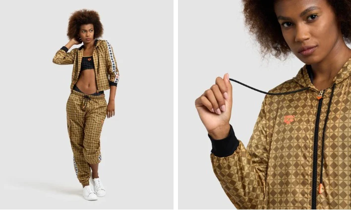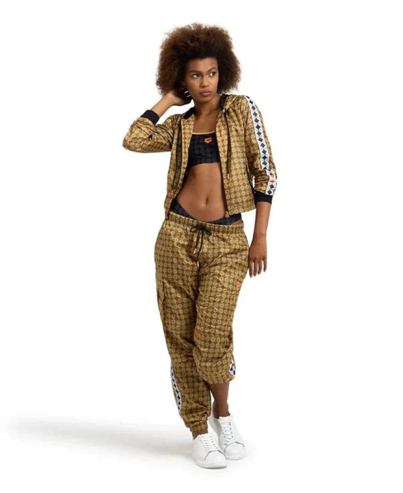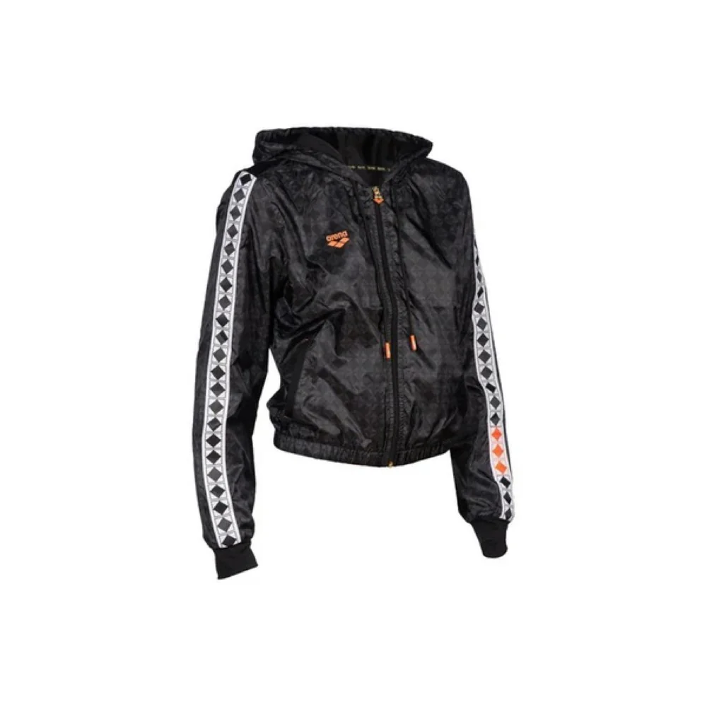 The 50th anniversary collection references arenas iconic style with a modern aesthetic that provides a window into the past with a focus on the future. Inspired by the brands original 3-diamond logo, the collection draws on trends from the 70s, 80s and 90s, merging this iconic heritage style with modern fabrics and contemporary silhouettes. This collection honors the past while embracing a new era of arena.GOLD, ORANGE AND BLACKGold representing our accomplishments throughout the years, orange our iconic legacy, and black capturing our strength and timeless style. The dramatic color palette of the 50th Anniversary Collection celebrates arenas tradition of medals, history, and strength.Part of the special collection created to celebrate arena's fifty years of passion for water sports, the arena 50th Anniversary Women's Hooded Crop Jacket perfectly combines retro sportswear with a modern silhouette. Made from a lightweight polyester, it is patterned with a fresh print of the original 1973 logo and vintage team stripe. Finished with zipped pockets, adjustable drawstring hood and ribbed trims, wear it with the matching track pants for a coordinated look.
