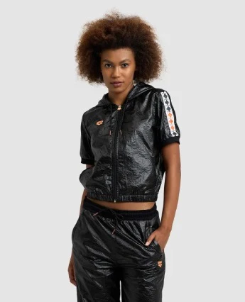 For fifty years we've sought out innovative textiles for our swimwear and athletic apparel. Part of our jubilee capsule, this women's arena 50th Shiny Black Hooded Jacket is cut from a crinkle-effect fabric with a sheen. It has a cropped silhouette and short sleeves embellished with a 1973 logo stripe. Finished with a branded zip pull in gold, this jacket is designed to be worn with the matching pants.