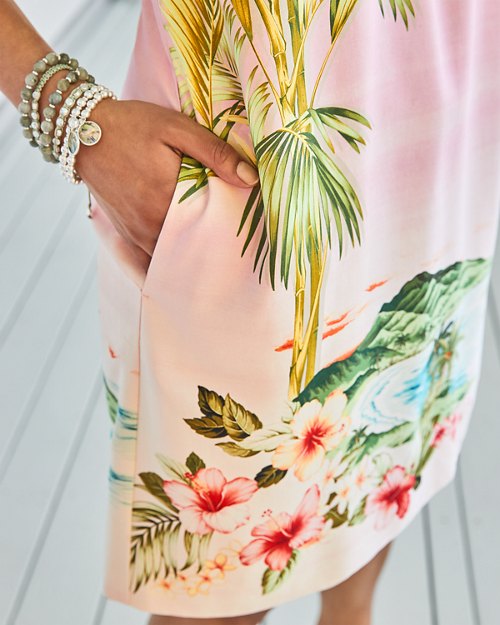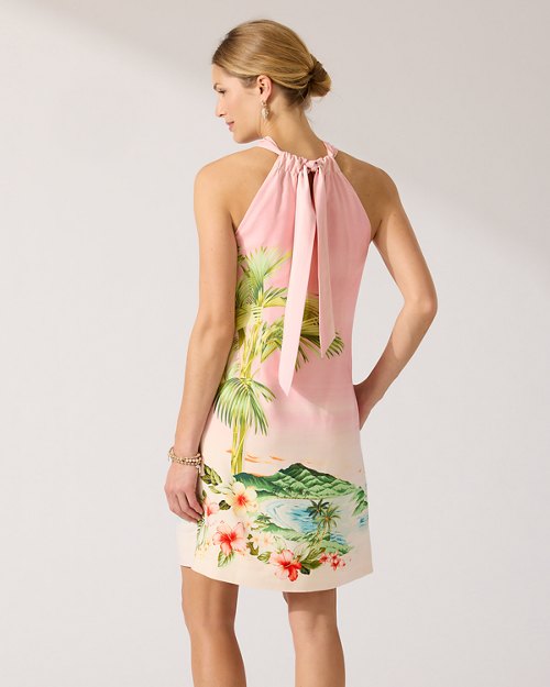 Get ready to stand out from the crowd with this beautiful Artist Series silk halter dress. When Beppe Spadacini was 10 years old, his father brought home a scenic postcard from Hawaii he had found at work. For the young Italian, it was love at first sight, and the beginning of his journey to becoming one of the country's top textile experts. A melding of two vintage pieces masterfully engineered to captivate the viewer, the Perfect Paradise print is a testament to Beppe's legacy as a master artist and illustrator—and a hearkening back to that 10-year-old boy and his postcard.