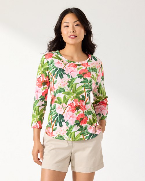Vibrant island blooms add even more feminine grace to this laid-back staple, in our incredibly soft Ashby Isles micro-rib cotton. Earn extra style points with the -length sleeves and universally flattering high-low hemline.