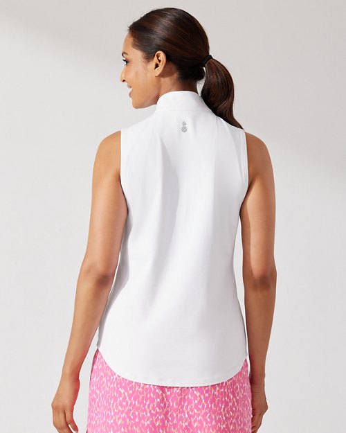 Function meets sleek style in this adorable, mock neck performance top that features a sporty sleeveless cut.