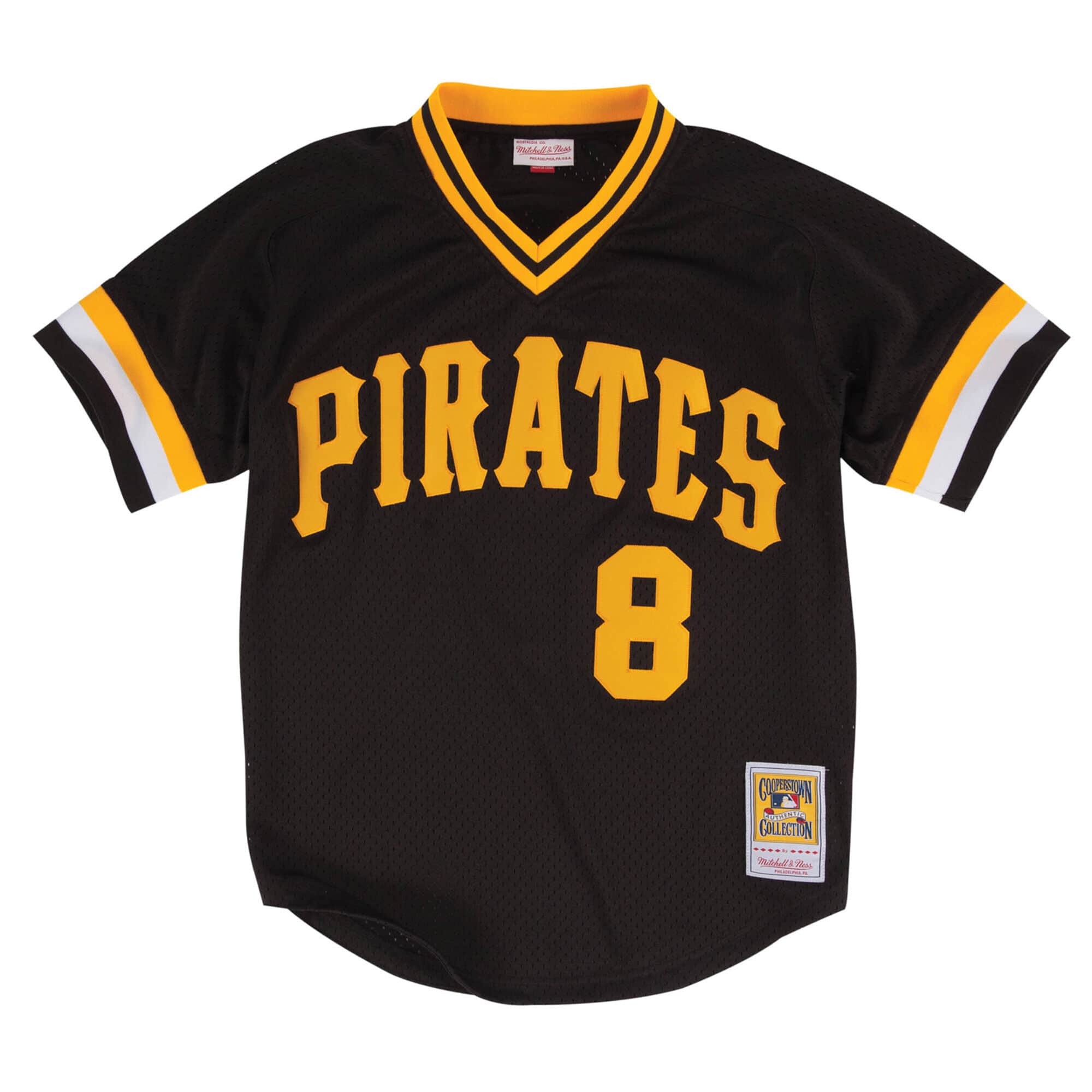 Authentic BP Jersey Pittsburgh Pirates 1982 Willie Stargell. 100% polyester lightweight mesh. Twill or sreenprinted logo name and numbers. V-neck. Woven league jocktag at lower left hem. Player name & year felt ID tag sewn into the back hem.