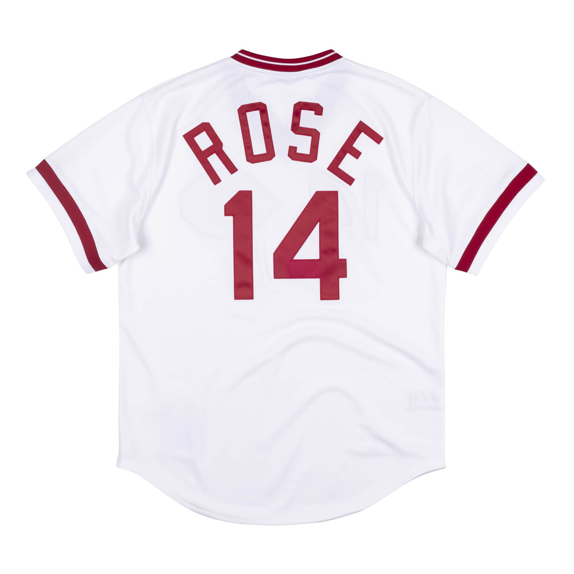 Authentic Jersey Cincinnati Reds 1975 Pete Rose. 100% polyester double knit body. Embroidered twill front logo. Twill name and numbers. Cooperstown Collection woven jocktag. Self fabric year ID patch.