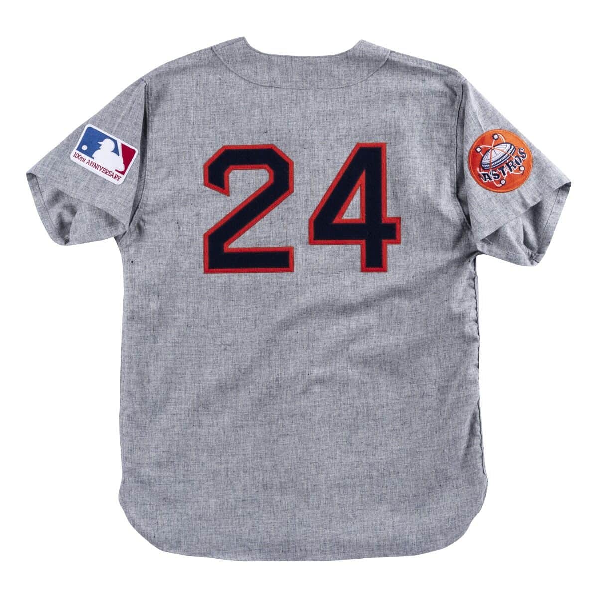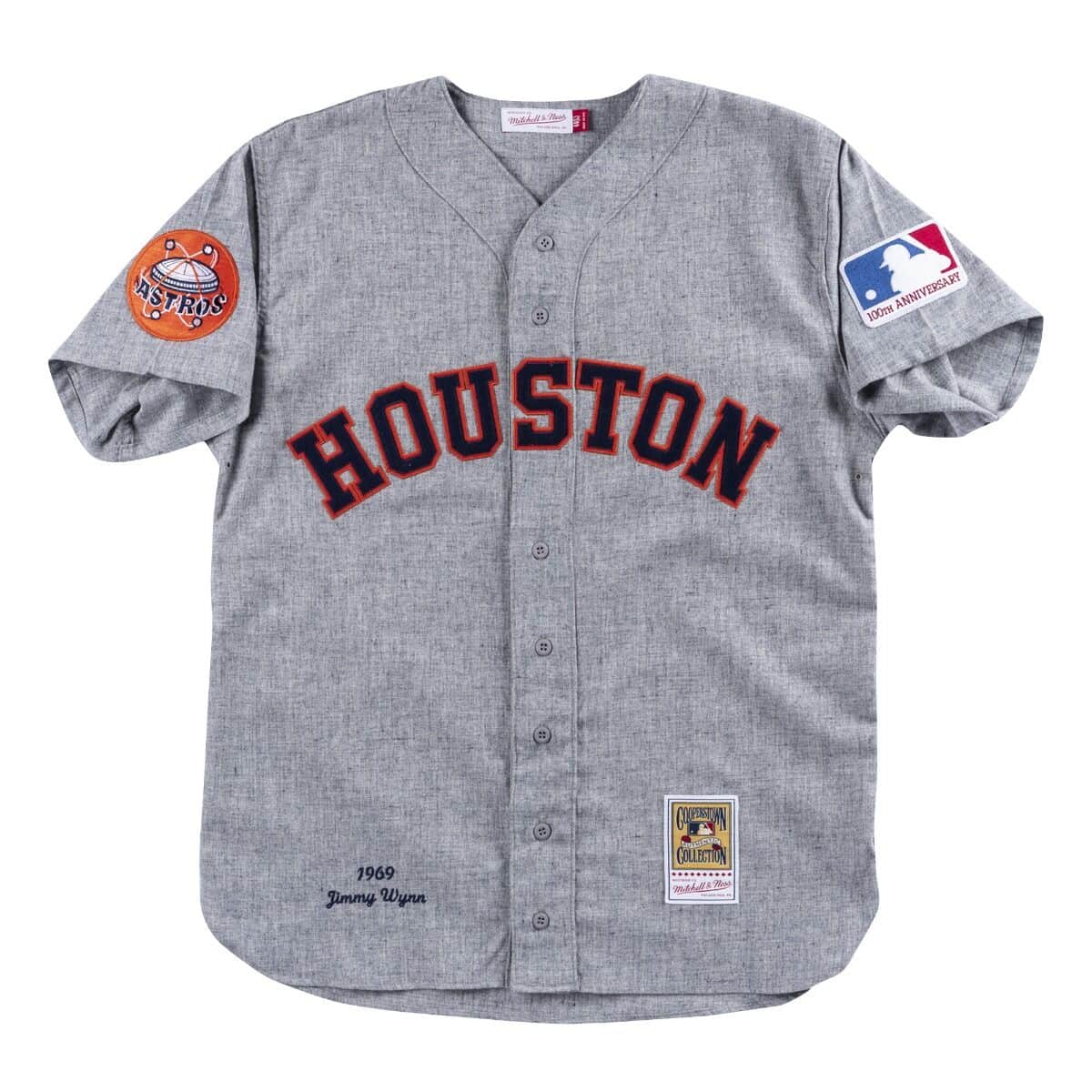 Authentic Jersey Houston Astros Road 1969 Jimmy Wynn. 100% wool body. Two color twill logo and number. Embroidered twill Astrodome patch on right sleeve. 100th anniversary patch on left sleeve. Direct embroidered name/year ID. Sewn-on woven Authentic Collection tag. Button front closure.