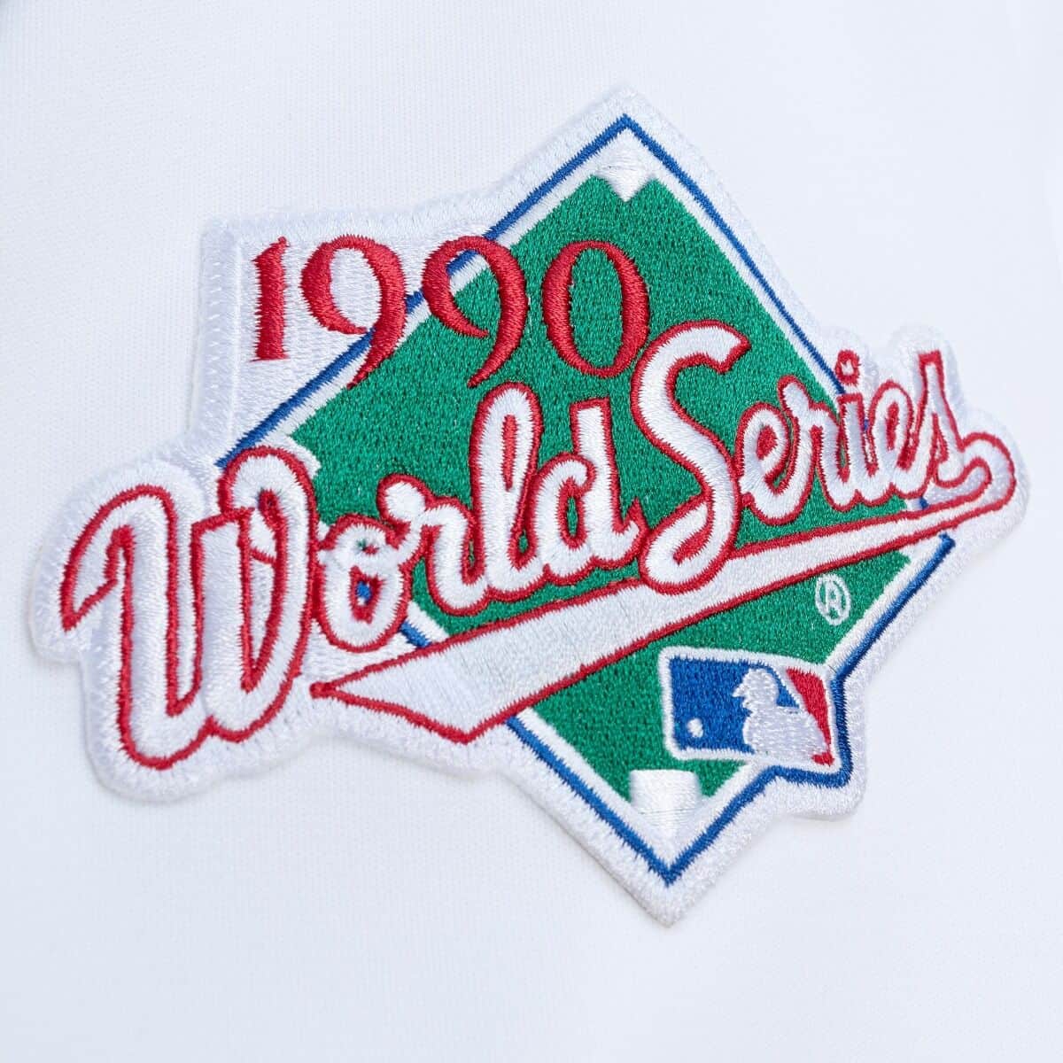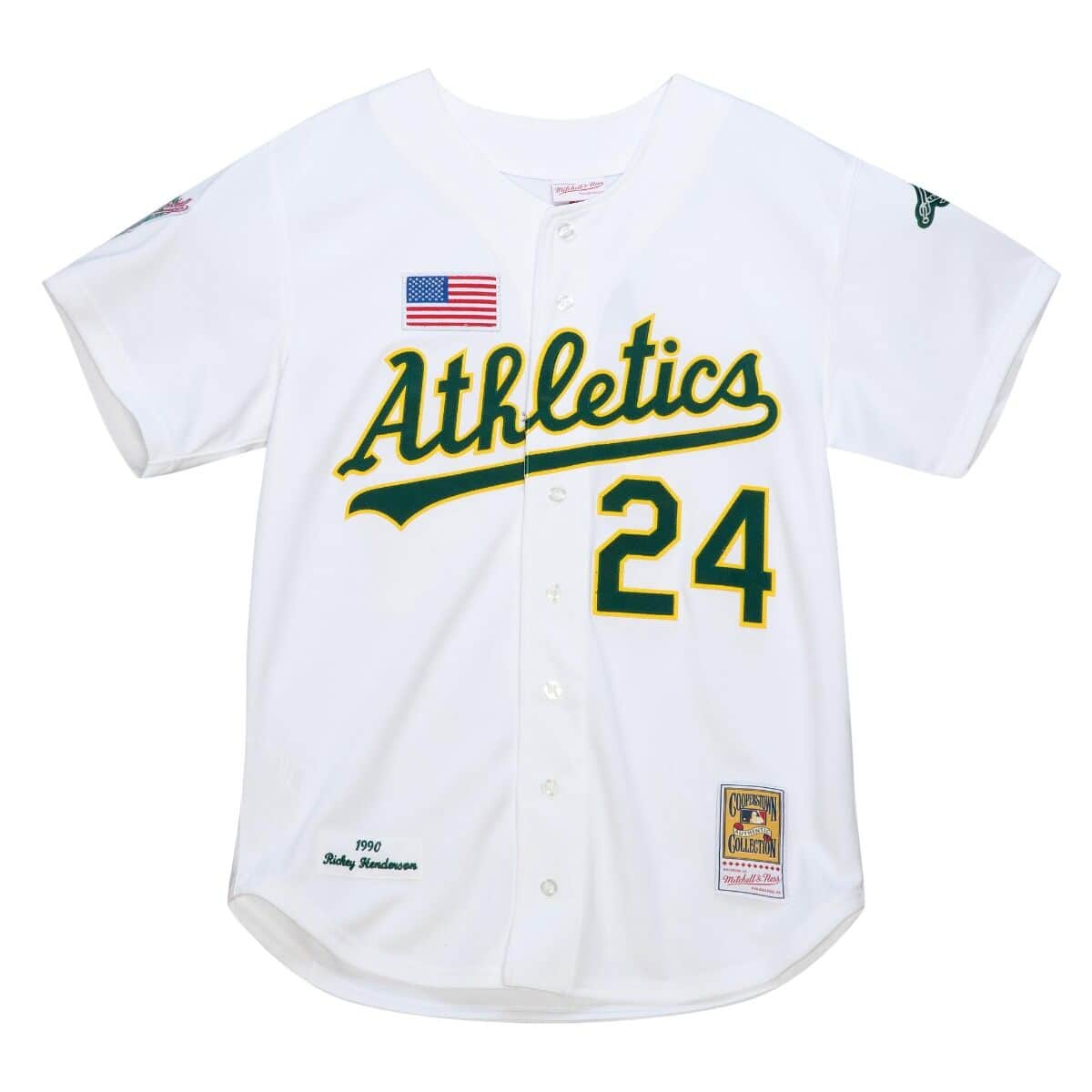 Authentic Jersey Oakland Athletics Home 1990 Rickey Henderson. 100% polyester doubleknit body. Two color twill front logo and number. One color twill back name. Two color twill back number. Direct embroidered name/year ID. Embroidered twill Athletics elephant logo patch on left sleeve. 1990 World Series logo pacth on right sleeve. Embroidered American flag patch at right chest. Button front closure.