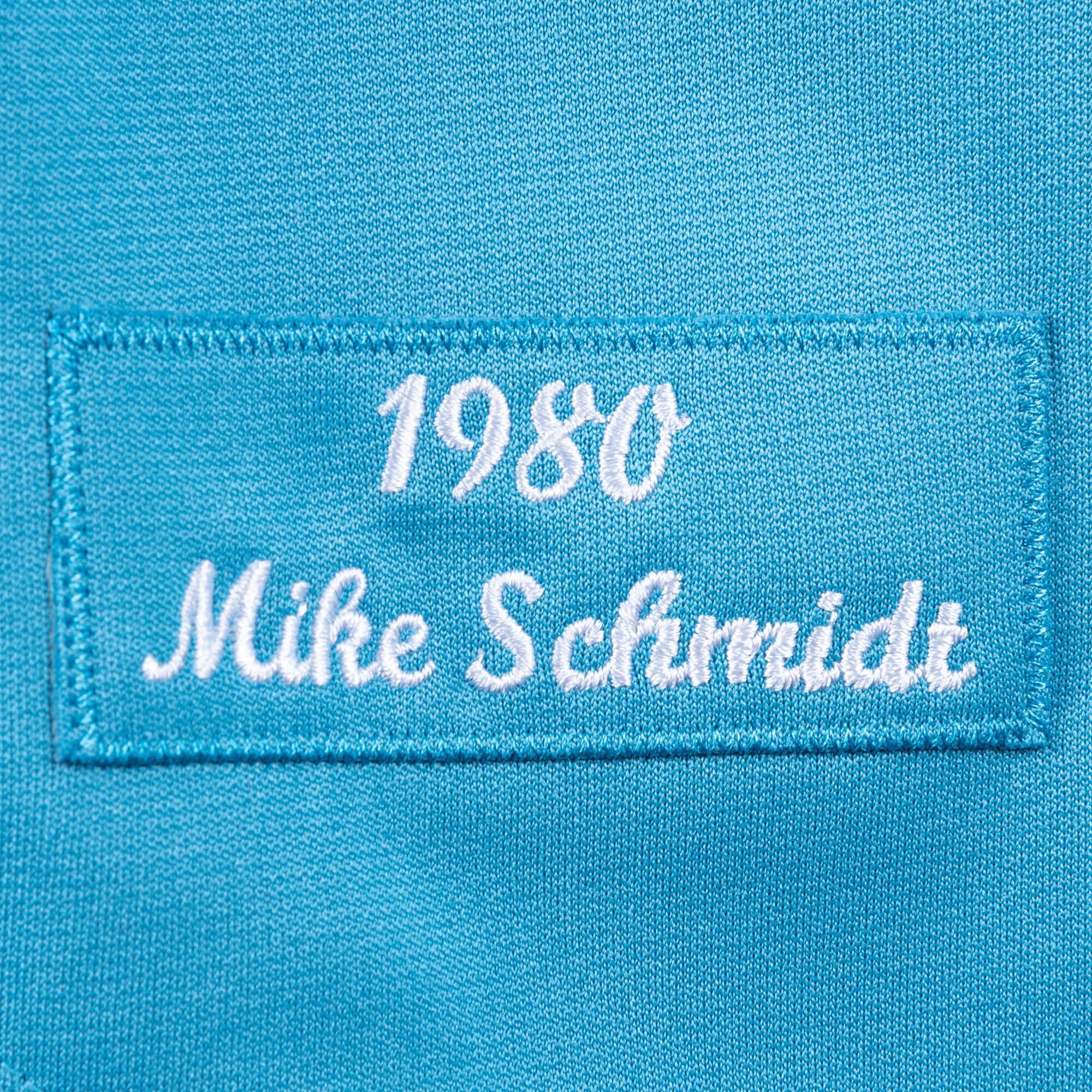 Authentic Jersey Philadelphia Phillies Road 1980 Mike Schmidt. 100% polyester doubleknit body. Two color twill logo name and number. Direct embroidered name/year ID. Sewn-on woven Authentic Collection tag. Zip front closure.