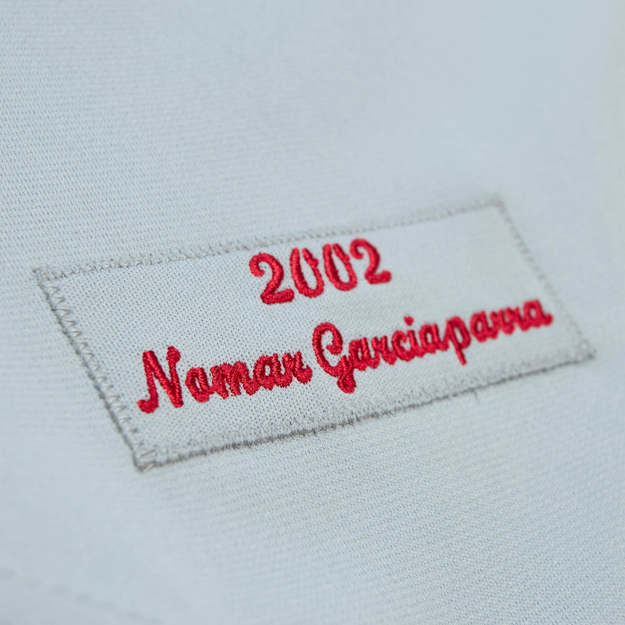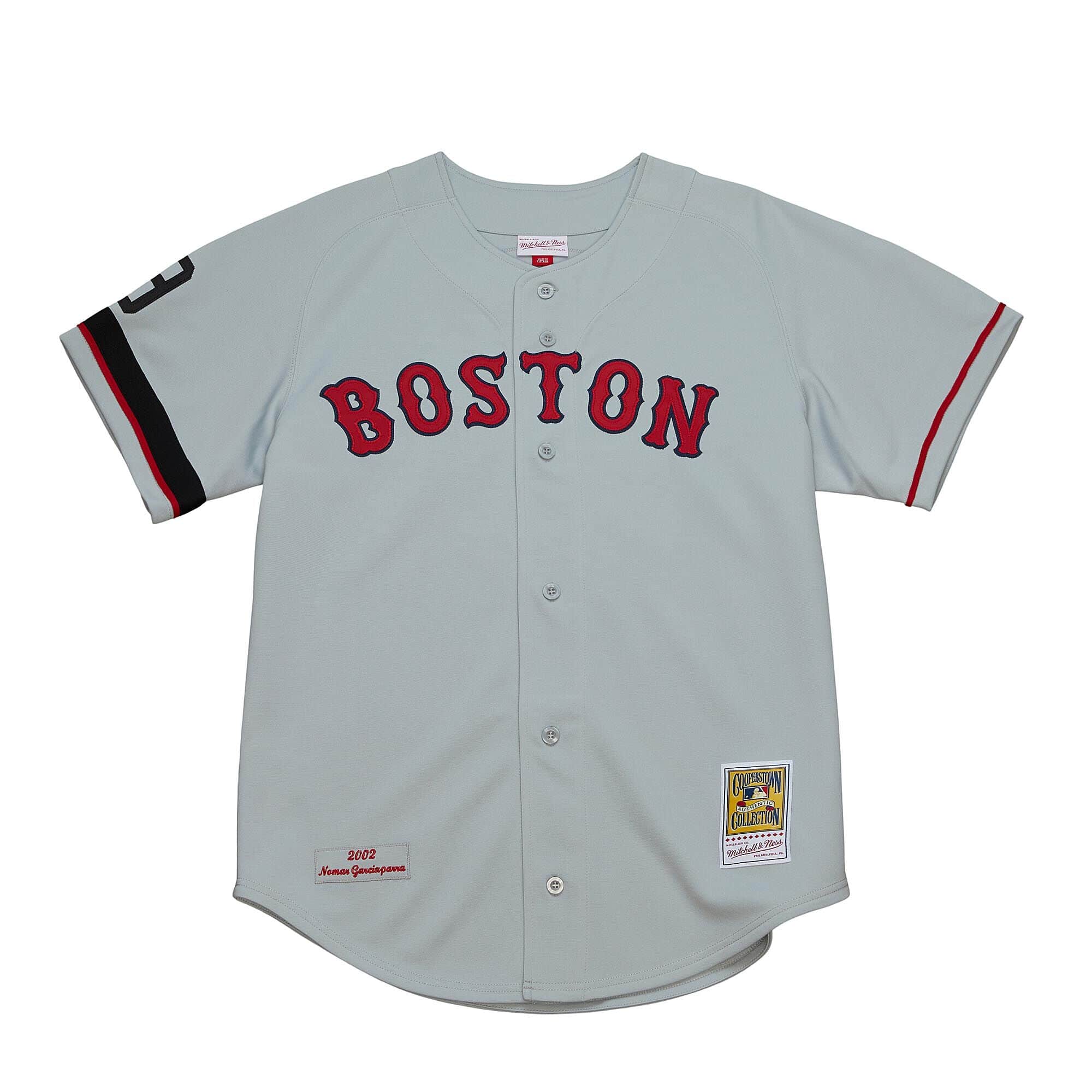 On July 5 2002 Red Sox legend Ted Williams passed away and to honor Teddy Ballgame the Sox wore #9 and a black armand from July 6 onward. Nomar Garciaparra had a strong season in this uniform as he made his fourth All-Star appearance and led the league in doubles with 56. This Cooperstown Collection Authentic Road Jersey features twill logo name and numbers embroidered felt name/year label and a twill #9 as well as black braid on the right sleeve. 100% Polyester.