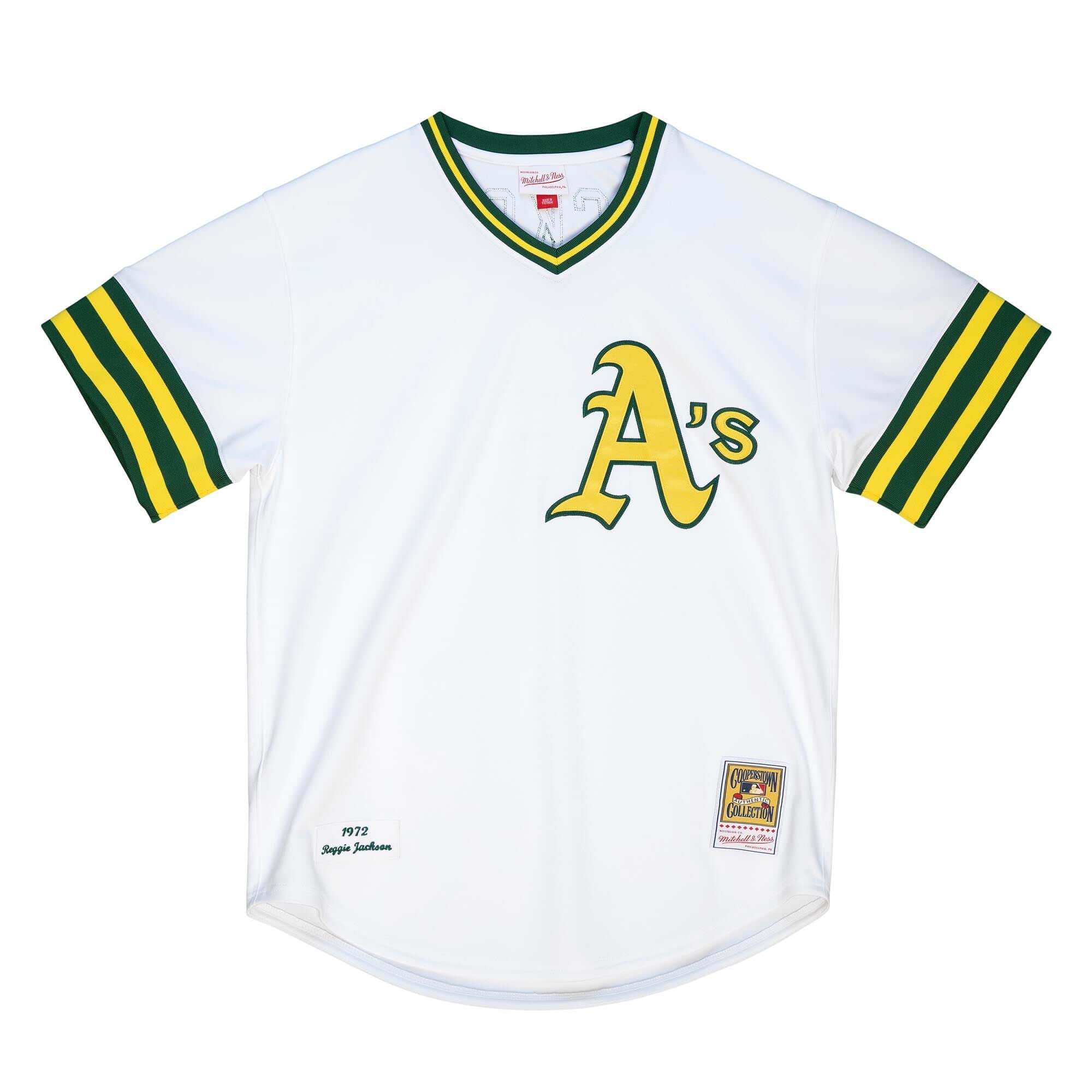 Authentic Reggie Jackson Oakland Athletics 1972 Jersey. 100% Polyester double knit body. Embroidered twill front logo. Twill name and numbers. Cooperstown Collection woven jocktag. Self fabric year ID patch.