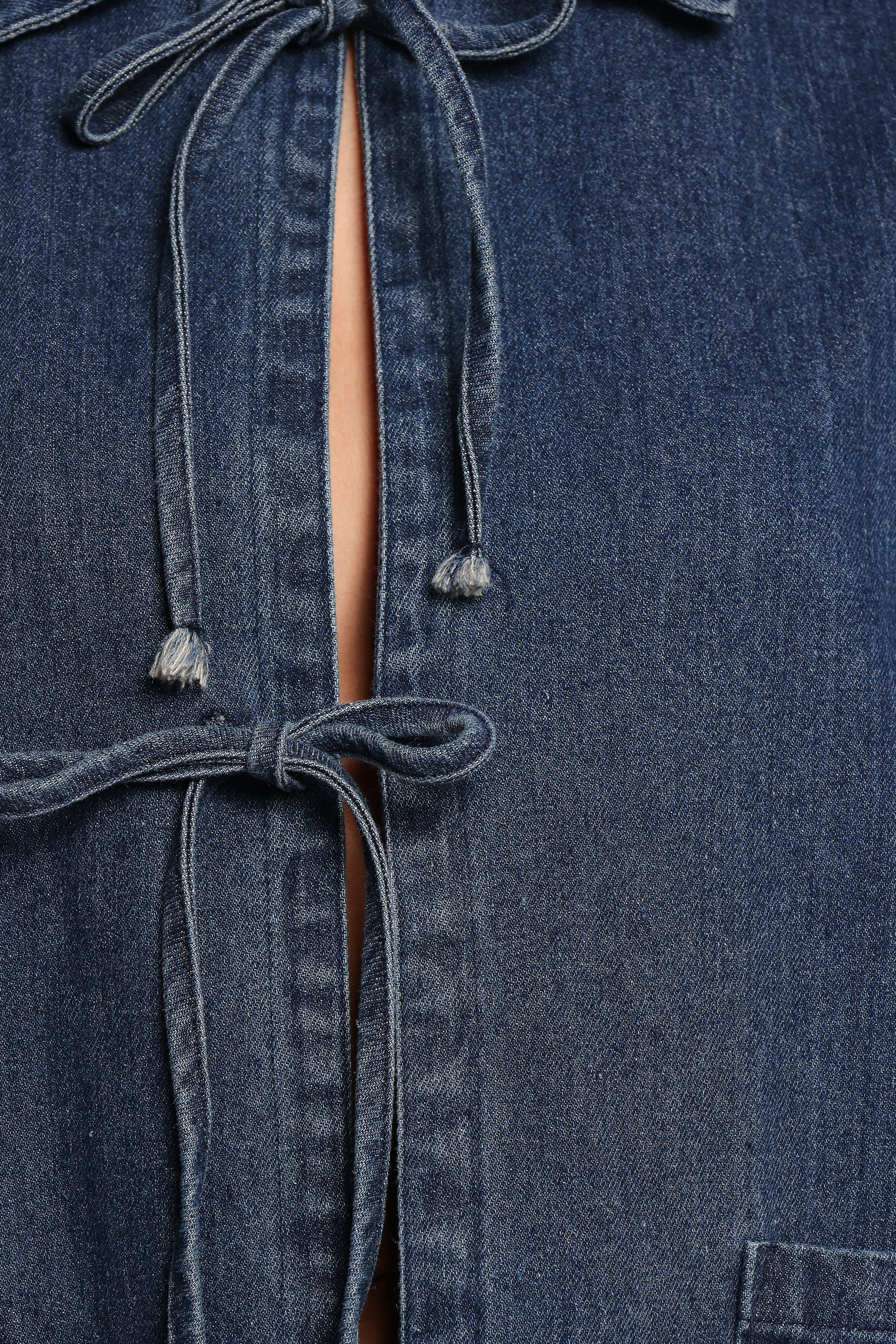 DETAILS Upgrade your wardrobe with the effortlessly stylish Avon Bow Front Denim Shacket. Featuring a spread collar and long sleeves, this versatile piece is your go-to for laid-back layering or creating a chic, curated vibe.
