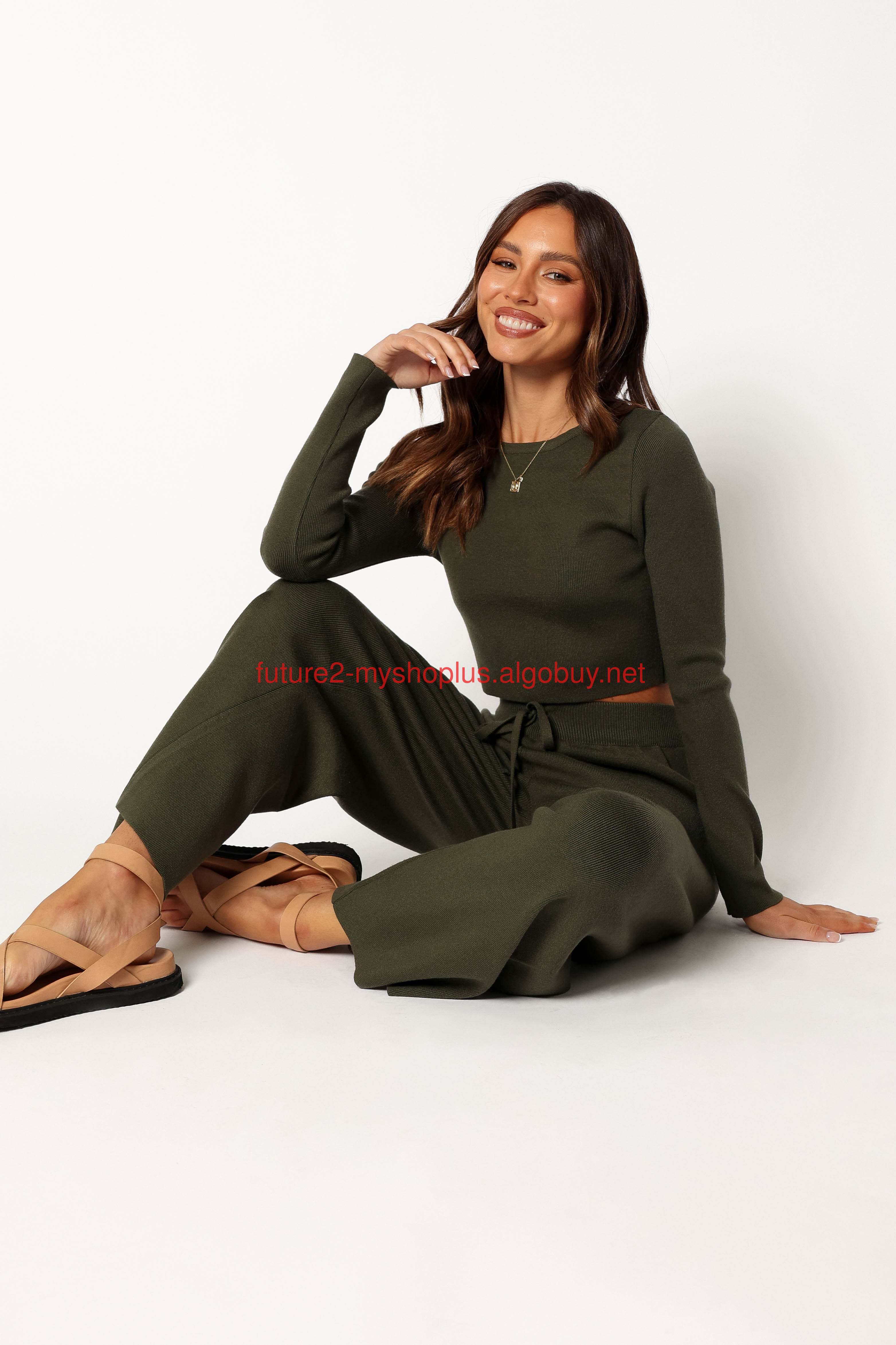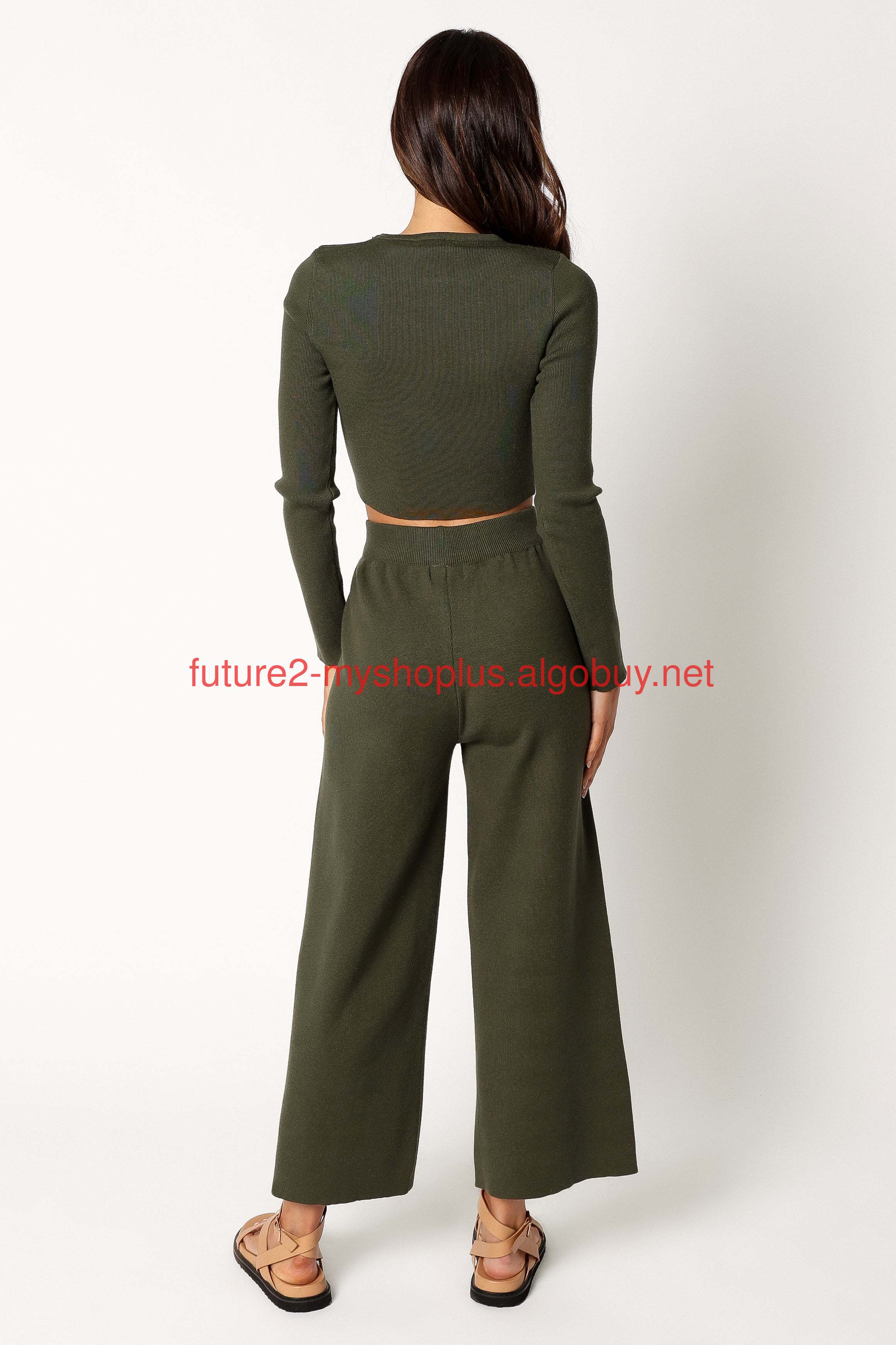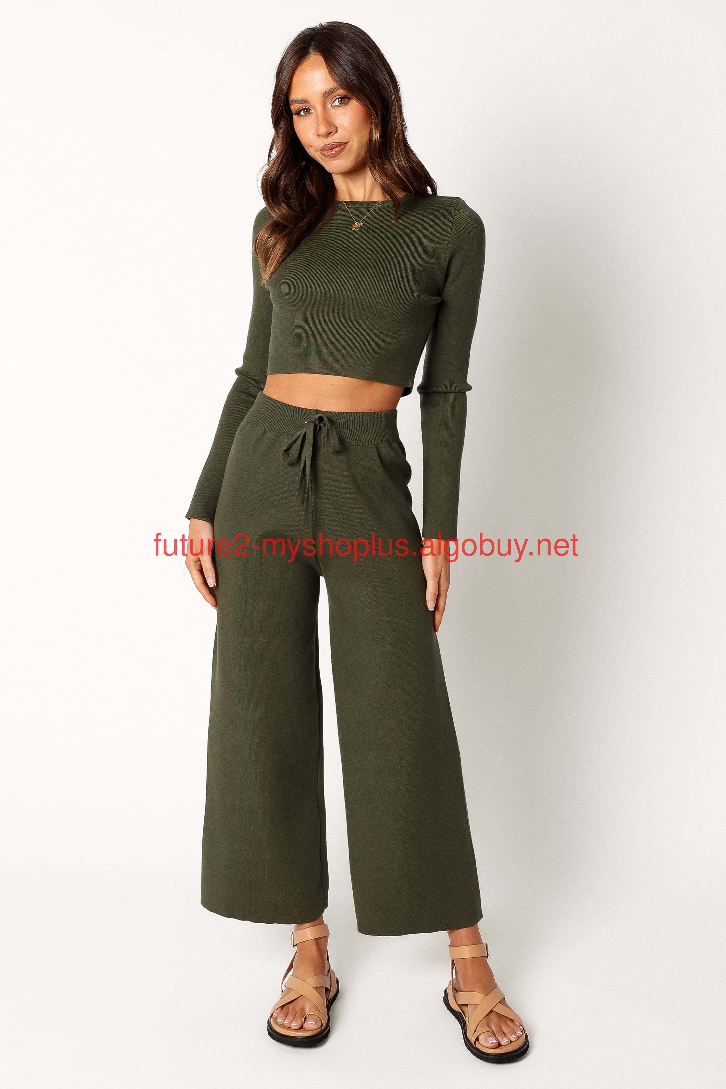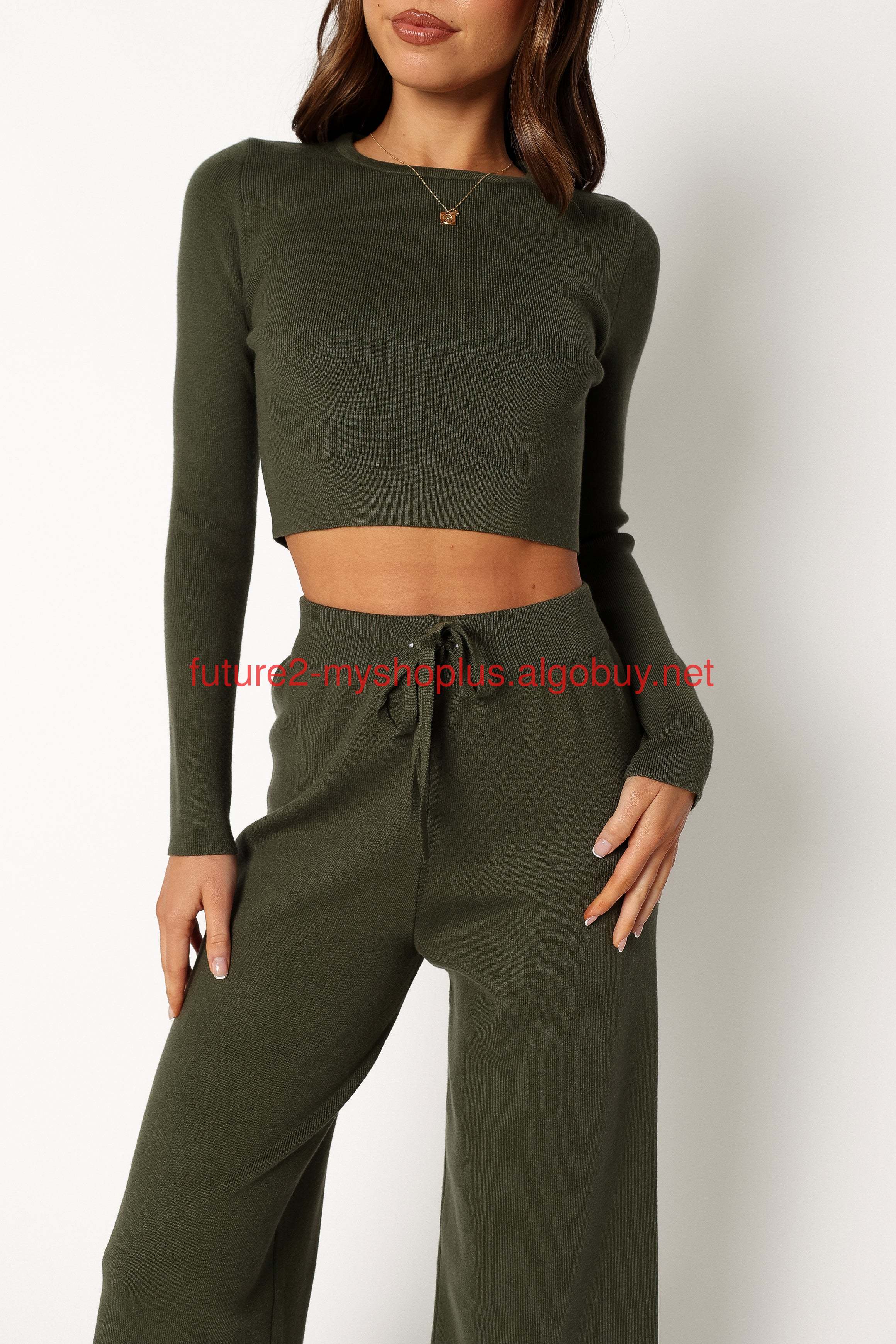 DETAILS This cozy top and pant set is a must-have for your weekend wardrobe! Crafted in a stretch ribbed fabric, the cropped length top features a round neckline and long sleeves while the high waisted pants feature an elasticised waistband with drawstring tie and wide leg style.