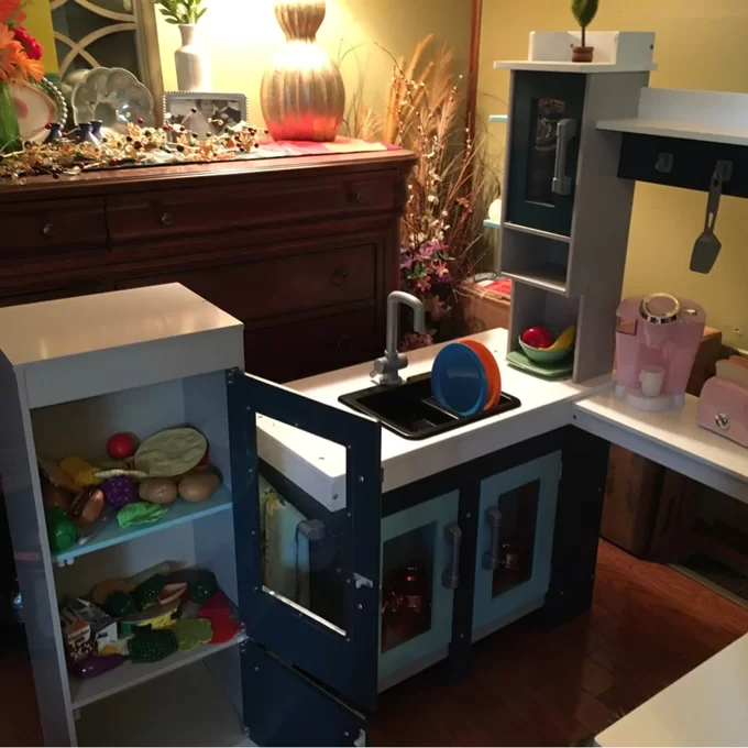 Be the envy of every little chef with the extra-large and luxurious Grand Walk Kitchen Set. This beautiful, premium kid’s play kitchen features a large walk-in U-shaped kitchen with a look-through refrigerator and oversized oven to match the modern design of today's kitchens. Junior chefs can show off their culinary skills by “cooking” on the stylish stovetop burners and grill-top range with oversized clicker knobs. Once the dinnertime fun is done, place the dishes in the sink to be cleaned or store them in the cabinets. This kid’s wooden kitchen will bring loads of fun to any playroom or bedroom.