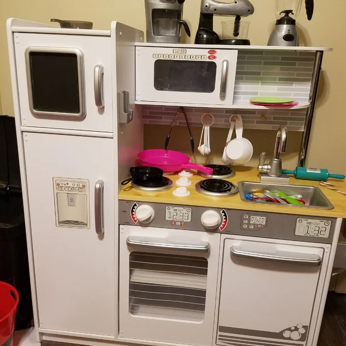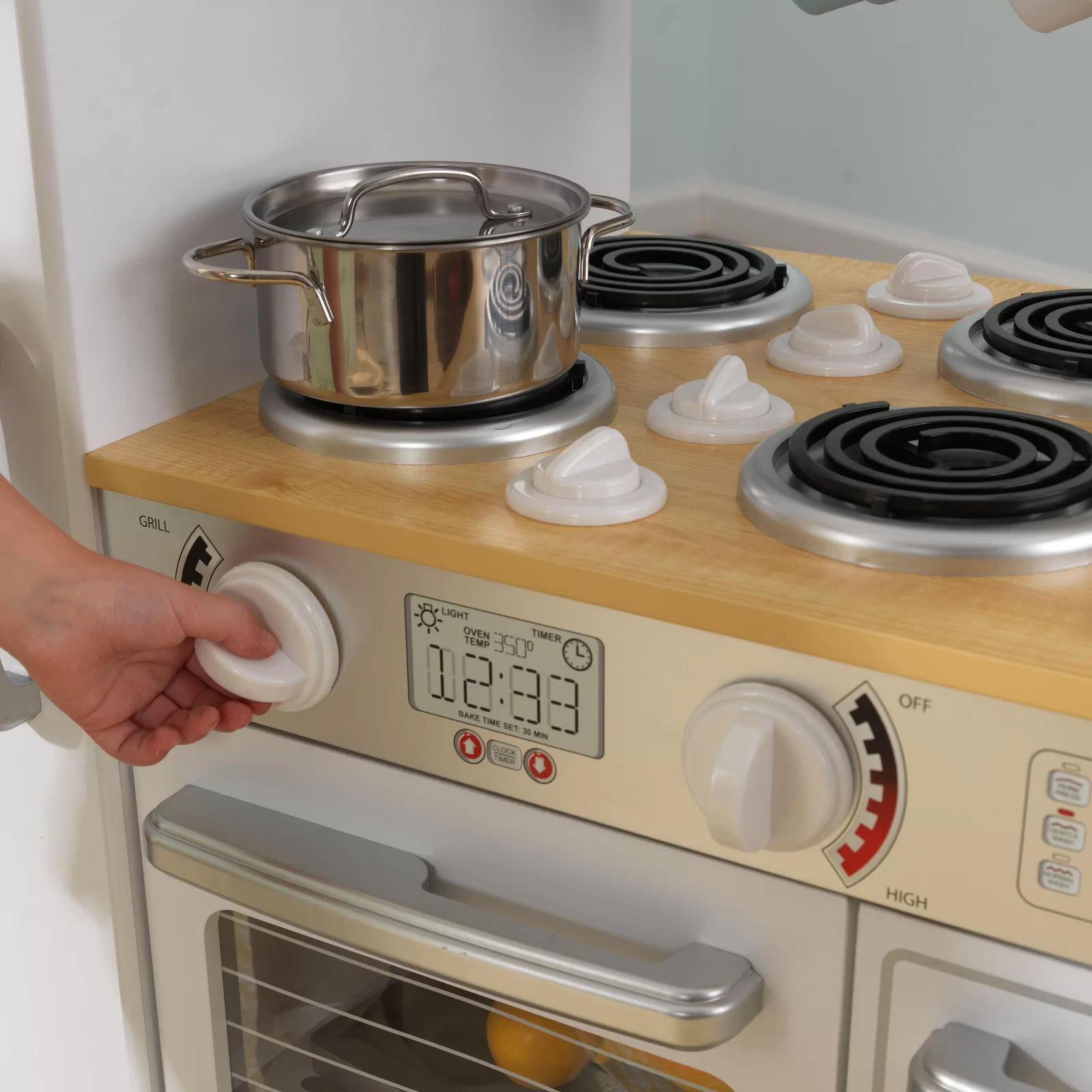 Time to cook up a little fun! Our Play Kitchen Set has a hip, modern look that young chefs are sure to love. Every appliance is interactive, including doors that open and close, knobs that turn and click, and a working chalkboard on the freezer door. Crafted from composite wood, this contemporary kitchen is a sturdy and stylish addition to playtime.