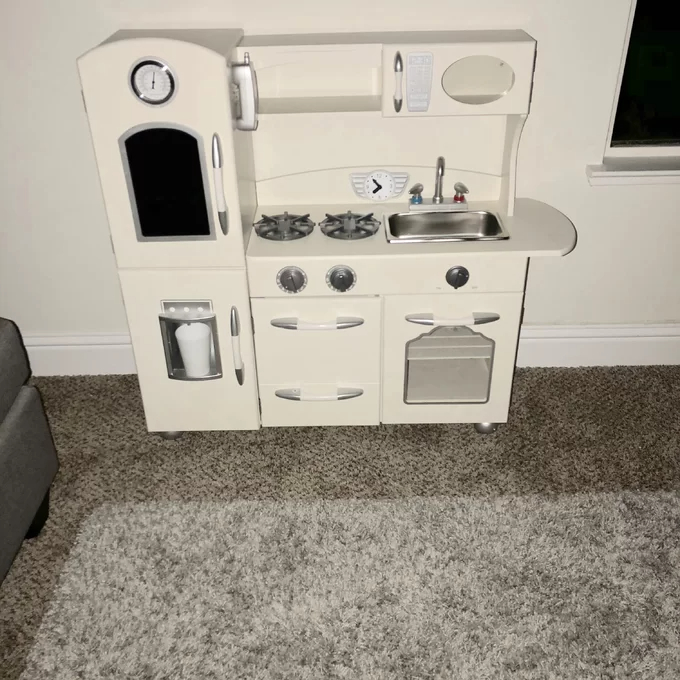 Give your little ones a kitchen of their own with this product. This retro-style play kitchen is designed with a classic white look and metallic accents, making it great for both boys and girls, and it completes any home, classroom, preschool, or daycare playroom. The functional and interactive design features an openable oven, refrigerator, and microwave doors, a chalkboard, and drink dispenser built into the refrigerator, 3 turning oven knobs, 2 oven burners, a storage cupboard, a sink, and an under-sink cabinet to enhance your little one's playtime. With the included toy cordless phone, this toddler kitchen encourages role play and lights up your little chef’s imagination and creativity. The easy-to-follow instructions allow for quick adult assembly so playtime can start right away. This kid-sized toy kitchen measures 38.25" x 11.5" x 36.75” and is recommended for children ages 3 years and up. For over 20 years, they have been manufacturing products of the highest quality along with the best craftsmanship. We take pride in our expertly crafted high-quality children's wooden furniture designs and strive to exceed all safety standards. We create beautiful pieces that encourage your child's imagination while seamlessly fitting into your home.
