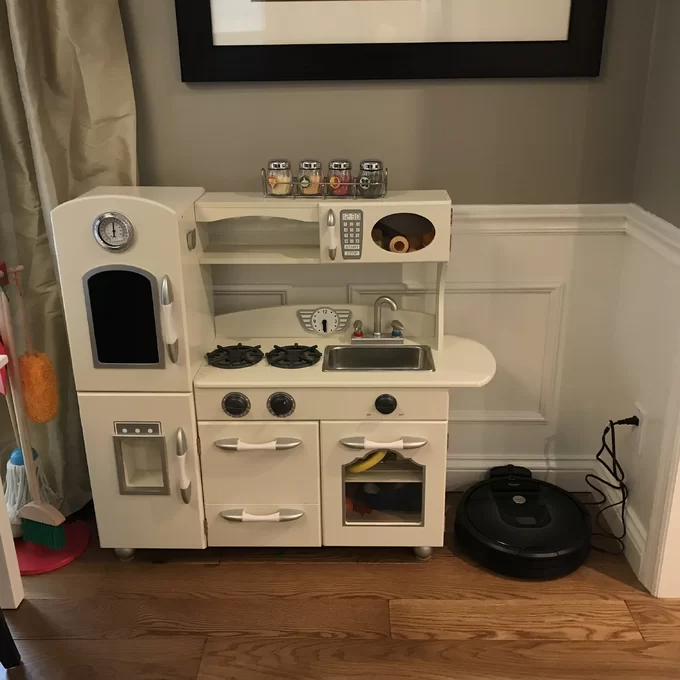 - INTERACTIVE FEATURES: Features openable oven, refrigerator, and microwave doors, a chalkboard and drink dispenser built into the refrigerator, 3 turning oven knobs, 2 oven burners, a storage cupboard, a sink, and an under-sink cabinet to enhance your little one's play time