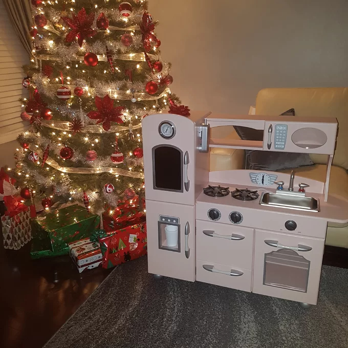 - KIDS PLAY KITCHEN SET: Retro-style kitchen playset with metallic accents is great for both boys and girls and completes any home, classroom, preschool, or daycare playroom