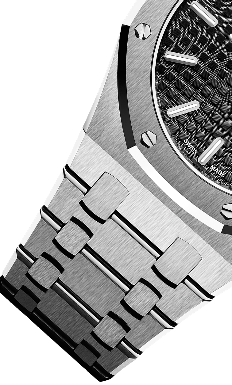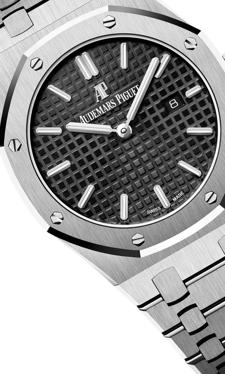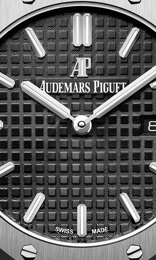 Black dial with “Grande Tapisserie” pattern, white gold applied hour-markers and Royal Oak hands with luminescent coating.