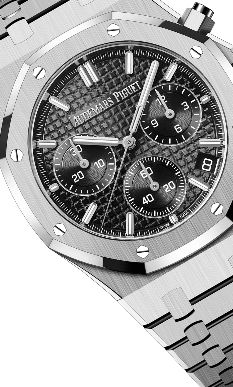 DIAL: Black dial with “Grande Tapisserie” pattern, black counters, white gold applied hour-markers and Royal Oak hands with luminescent coating.
