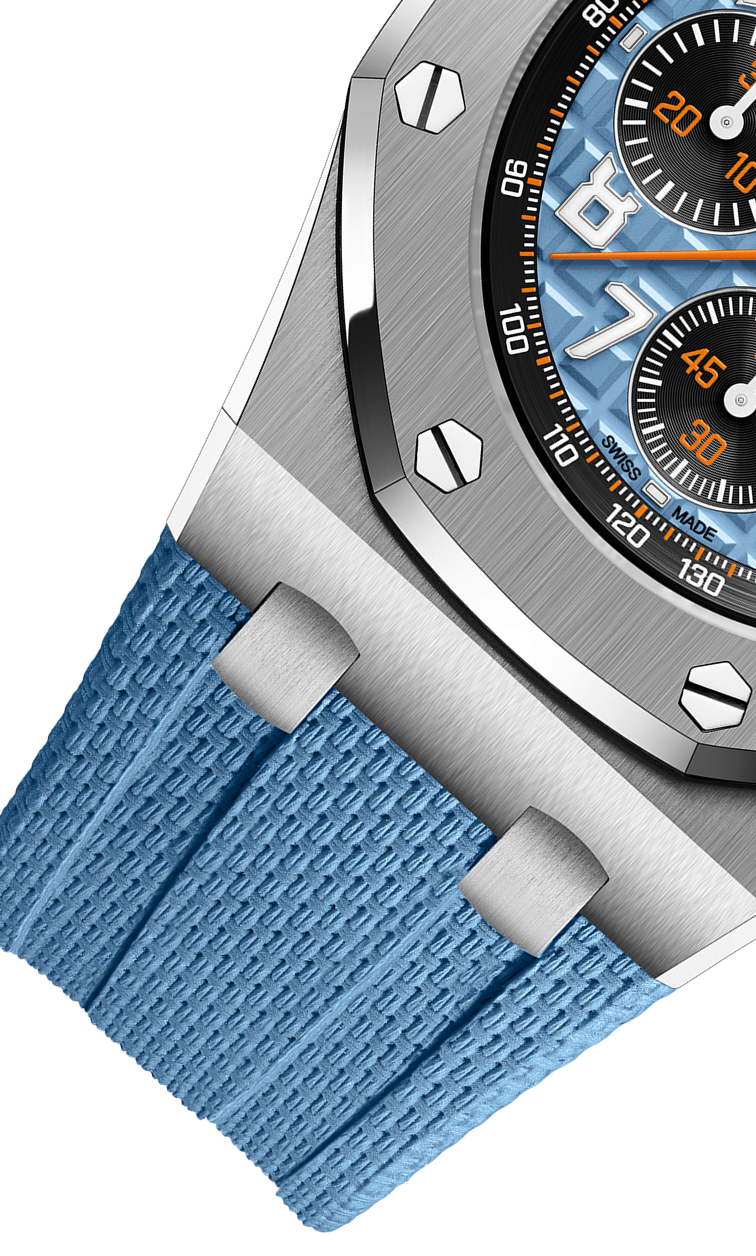 DIAL: Blue dial with “Méga Tapisserie” pattern, black counters, arabic numerals hour-markers and white gold Royal Oak hands with luminescent coating, black inner bezel.