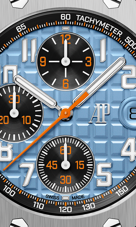 DIAL: Blue dial with “Méga Tapisserie” pattern, black counters, arabic numerals hour-markers and white gold Royal Oak hands with luminescent coating, black inner bezel.
