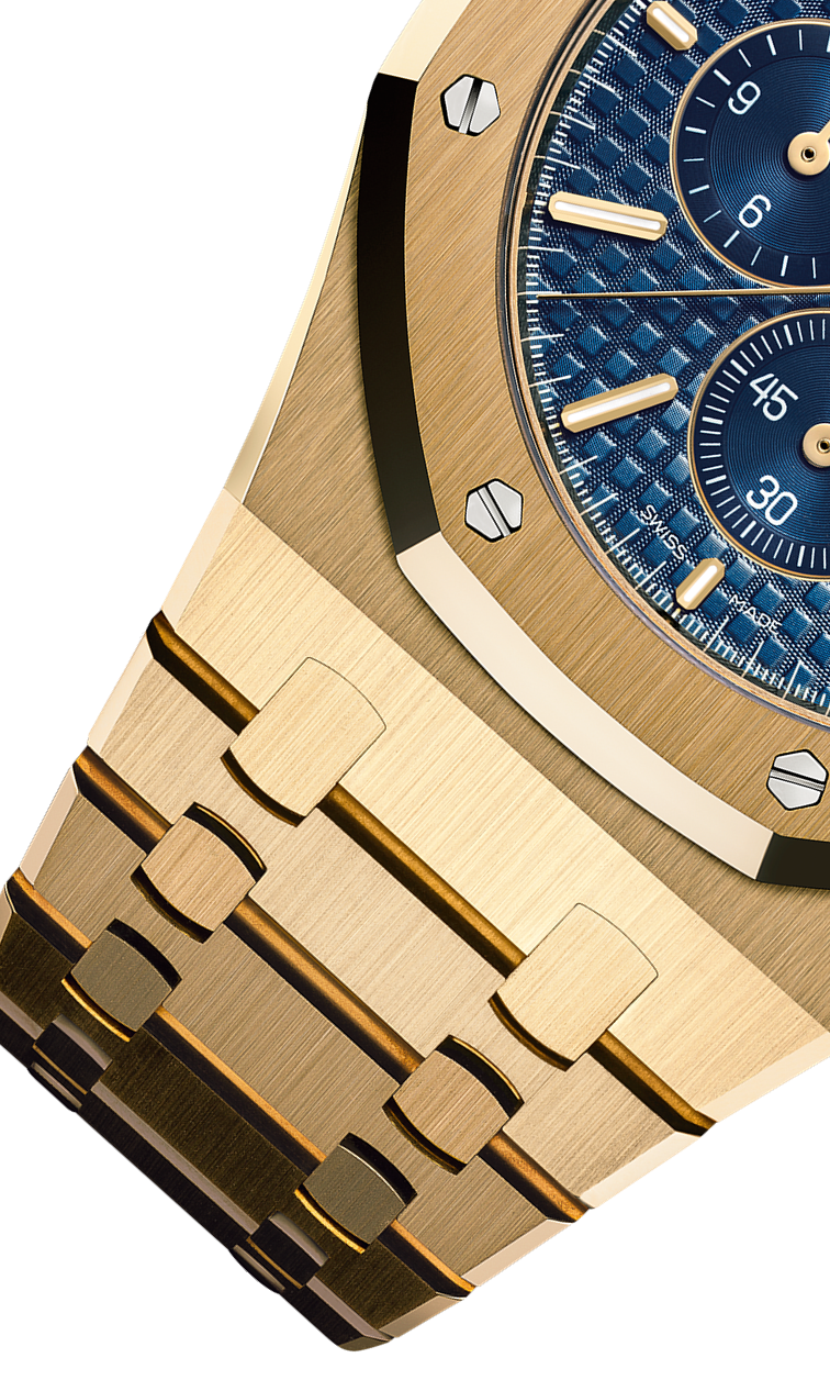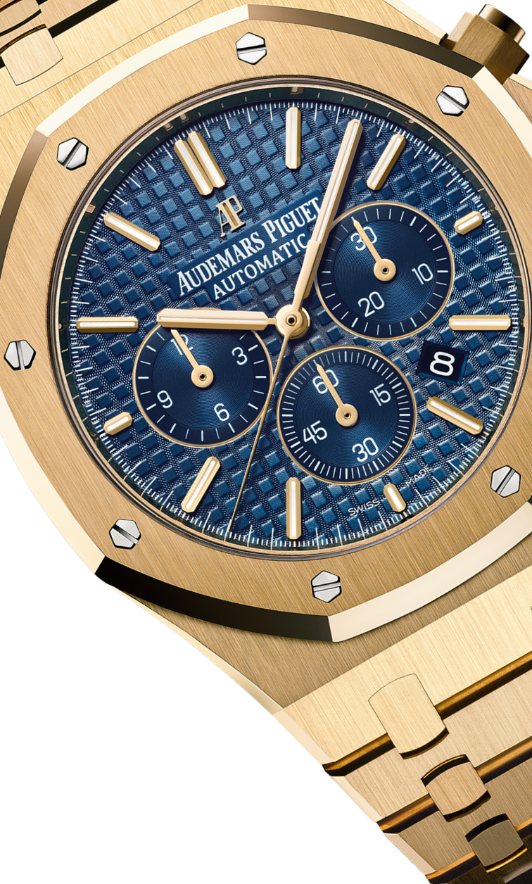 DIAL : Blue dial with “Grande Tapisserie” pattern, Blue counters, yellow gold applied hour-markers and Royal Oak hands with luminescent coating