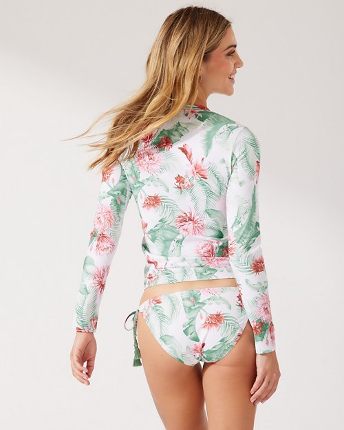 Whether you're catching waves or lounging in the sand, this rash guard is the perfect companion for all your seaside adventures, providing both sun protection and island charm so you can feel and look your best.