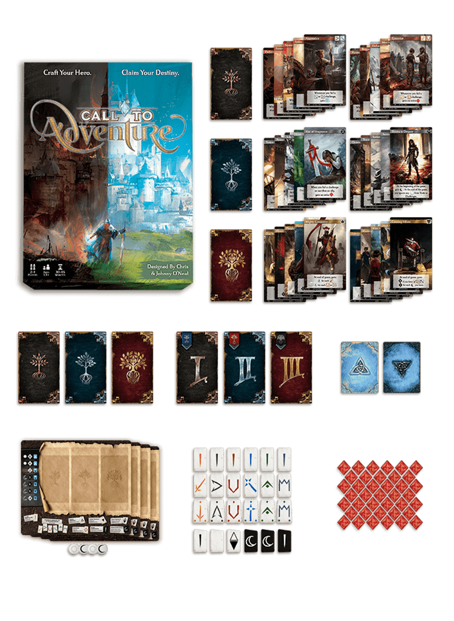 Call to Adventure is a tabletop game in which players compete to craft the hero with the greatest destiny. Play cards to build your character, cast runes to face challenges, and choose whether to follow a path of heroism or villainy. The core game mode is a 2-4 player competitive game, but Call to Adventure can also be played solo or cooperatively!