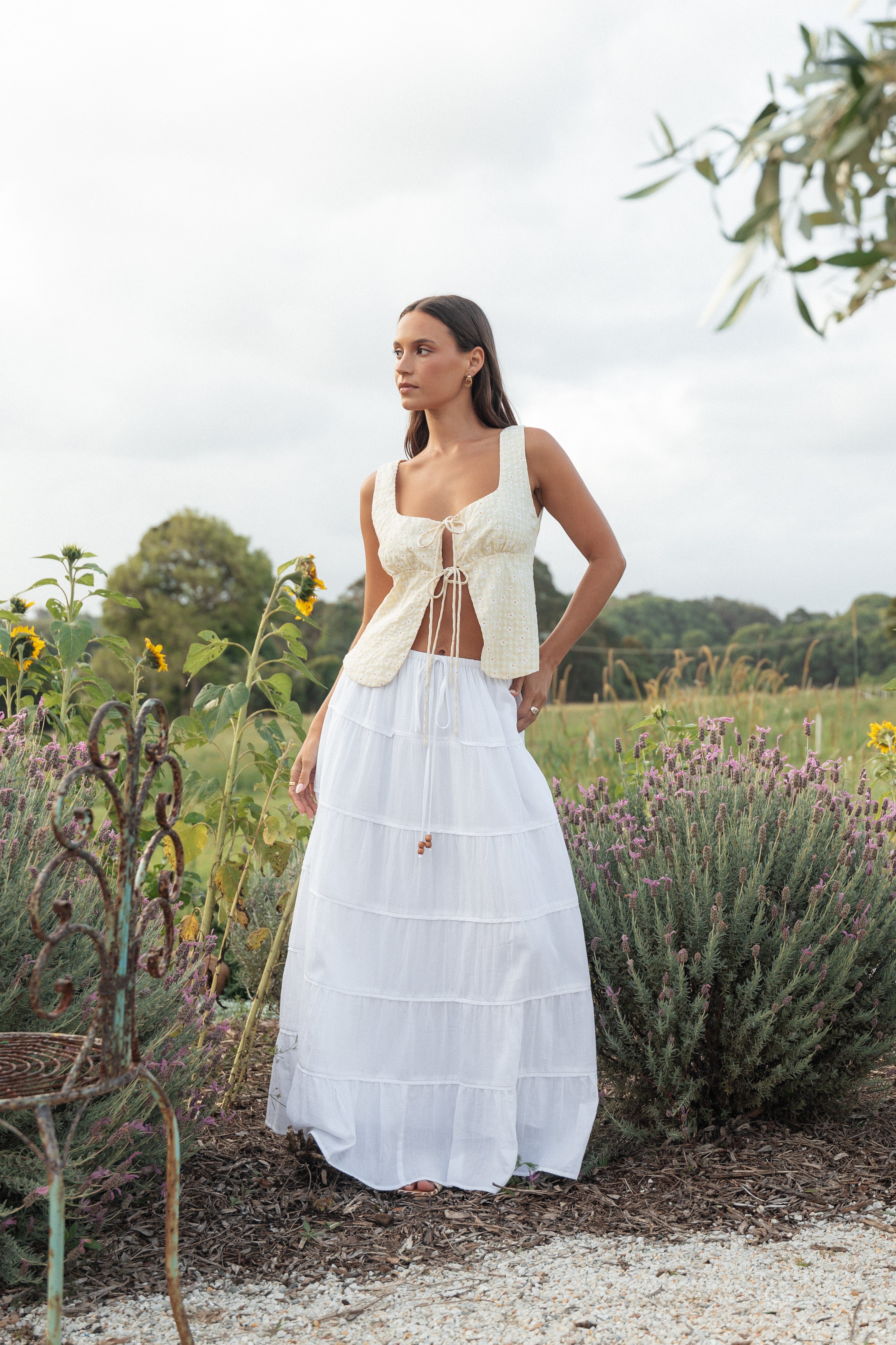 DETAILS The Capra Top in Yellow Gingham, a must-have for elevating your summer wardrobe. Its playful sweetheart neckline and the delicate daisy print on sunny yellow gingham that evokes nostalgic summer picnics.