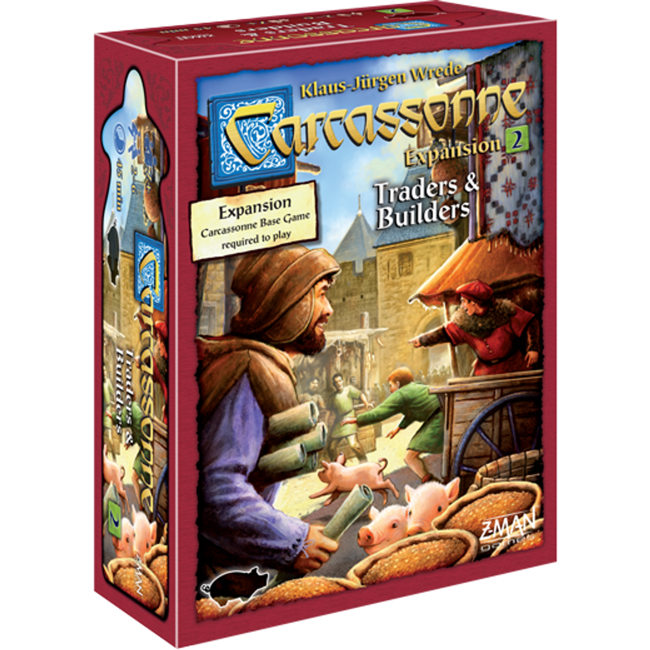 Traders & Builders expands on the popular Carcassonne base game, adding new features and opening even more ways to outwit your opponents. With the new builder follower, you can speed up construction by placing another tile immediately after you add a Land tile to a road or city that your builder occupies. Further, the pig followers and Goods tokens give you more ways to score points. The pig enhances the value of any farmers you have in the same field, while completing cities with Goods icons on them awards Goods tokens; the player with the most gains bonus points at the end of the game.
