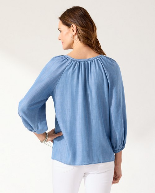 We are obsessed with the buttery softness and supreme versatility of this chambray top. From the go-with-anything hue to the flirty, feminine details, this effortless piece will quickly become your go-to for backyard BBQs and trips to town alike.