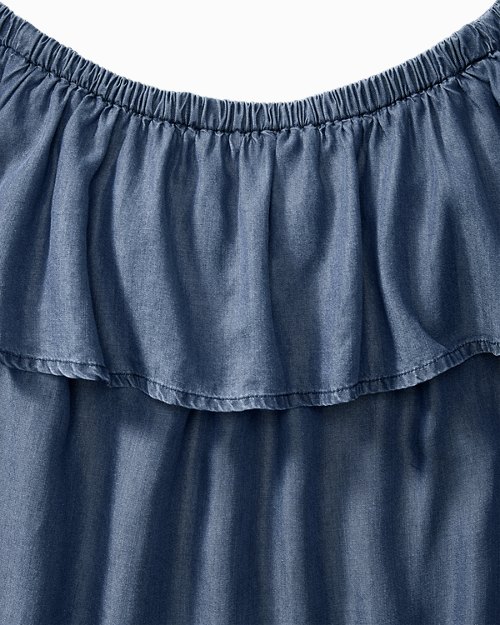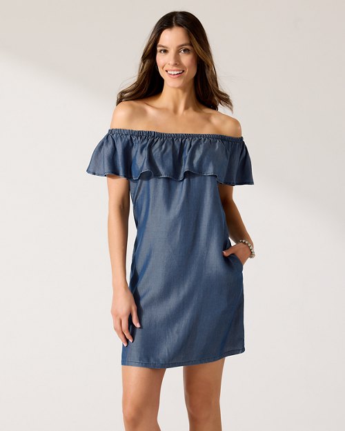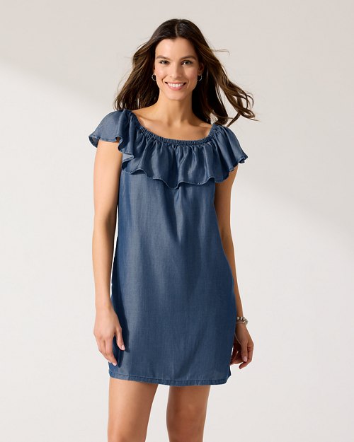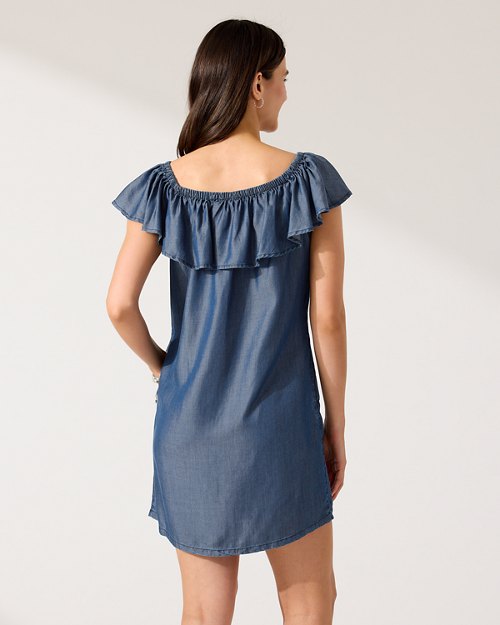 This sweet and super-soft chambray dress is done in an off-the-shoulder silhouette and features a fun ruffle detail that takes this coverup to the next level.